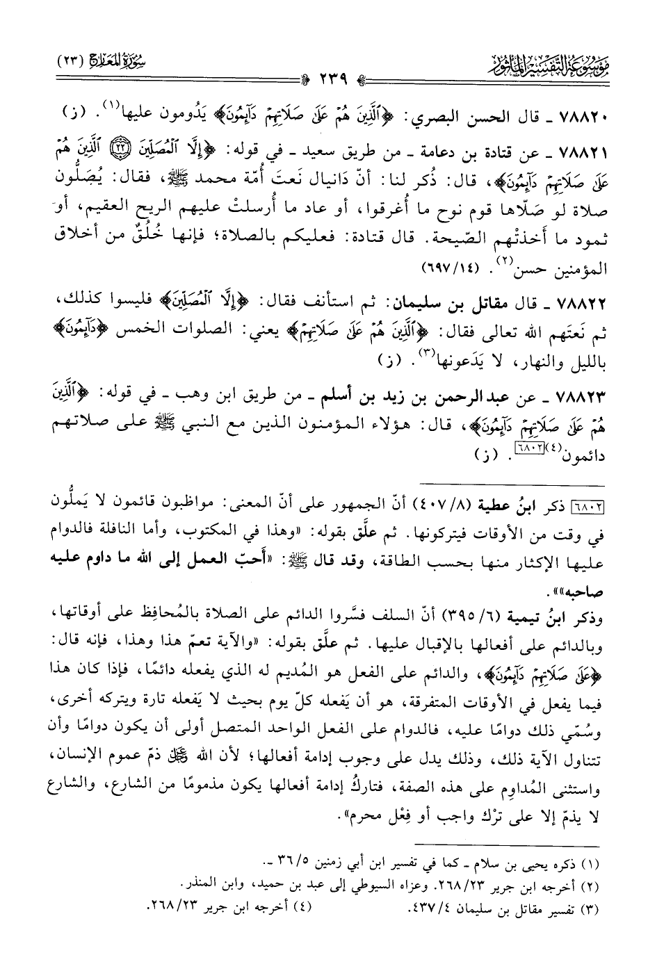 ٧٨٨٢٠ - قال الحسن البصري: {الَّذِينَ هُمْ عَلى صَلاتِهِمْ دائِمُونَ} يَدُومون عليها (¬١). (ز)