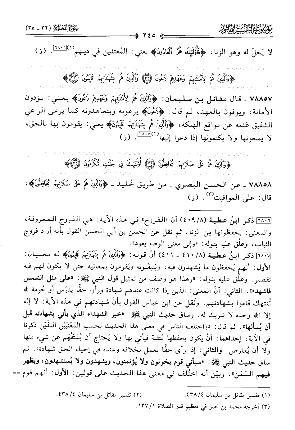 [٦٨٠٧] ذكر ابنُ عطية (٨/ ٤١٠ - ٤١١) أنّ قوله: {والذين هم بشهاداتهم قائمون} له معنيان: الأول: أنهم يَحفظون ما يَشهدون فيه، ويَتيقّنونه ويَقومون بمعانيه حتى لا يكون لهم فيه تقصير. وعلَّق عليه بقوله: «وهذا هو وصف من تمثيل قول النبي - صلى الله عليه وسلم -: «على مثل الشمس فاشهد»». الثاني: أنّ المعنى: الذين إذا كانت عندهم شهادة ورأوا حقًّا يدرَس أو حُرمة لله تُنتهك قاموا بشهادتهم. ونَقل عن ابن عباس القول بأنّ شهادتهم في هذه الآية: لا إله إلا الله وحده لا شريك له. وساق حديث النبي - صلى الله عليه وسلم -: «خير الشهداء الذي يأتي بشهادته قبل أن يُسألها». ثم قال: «واختلف الناس في معنى هذا الحديث بحسب المَعْنَيَيْن اللذَيْن ذكرنا في الآية، إحداهما: أنْ يكون يحفظها مُتقنة فيأتي بها ولا يَحتاج أن يُسْتَفْهَم عن شيء منها ولا أن يُعارَض. والثاني: إذا رأى حقًّا يعمل بخلافه وعنده في إحياء الحق شهادة». ثم ساق حديث النبي - صلى الله عليه وسلم -: «سيأتي قوم يخونون ولا يُؤتمنون، ويشهدون ولا يُستشهدون، ويظهر فيهم السّمَن». وبيّن أنه اختُلف في معنى هذا الحديث على قولين: الأول: أنهم قوم مُؤمنون يَتعرّضون ويحرصون على وضْع أسمائهم في وثائق الناس، وينصبون لذلك الحبائل من زي وهيئة وهم غير عُدول في أنفسهم فيغرّون بذلك ويَضرّون. وعلَّق عليه بقوله: «فهذا في ابتداء الشهادة لا في أدائها، ويجيء قوله - صلى الله عليه وسلم -: «ولا يُستشهدون»، أي: وهم غير أهل لذلك». الثاني: أنهم هم شهود الزُّور، يؤدونها، والمشهود عليهم لم يشهدهم، ولا الآخر".