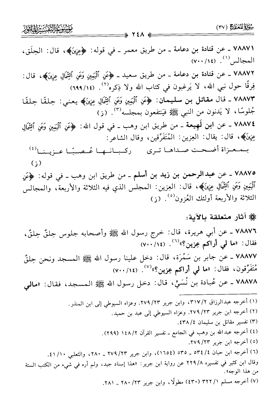 ٧٨٨٧٥ - عن عبد الرحمن بن زيد بن أسلم -من طريق ابن وهب- في في قوله: {عَنِ اليَمِينِ وعَنِ الشِّمالِ عِزِينَ}، قال: العِزين: المجلس الذي فيه الثلاثة والأربعة، والمجالس الثلاثة والأربعة أولئك العُزون (¬٥). (ز)