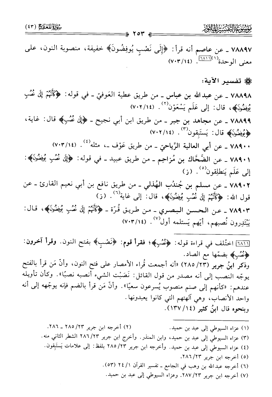٧٨٨٩٩ - عن مجاهد بن جبر -من طريق ابن أبى نجيح- {إلى نُصُبٍ} قال: غاية، {يُوفِضُونَ} قال: يَستَبِقون (¬٣). (١٤/ ٧٠٢)