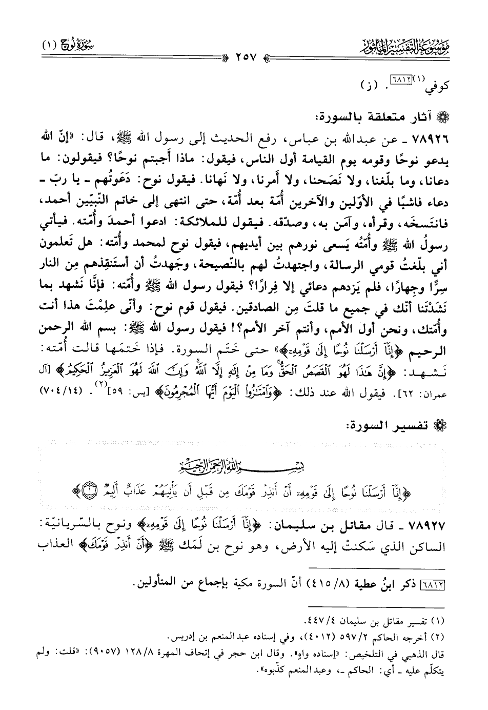 ٧٨٩٢٧ - قال مقاتل بن سليمان: {إنّا أرْسَلْنا نُوحًا إلى قَوْمِهِ} ونوح بالسّريانيّة: الساكن الذي سَكنتْ إليه الأرض، وهو نوح بن لَمَك - صلى الله عليه وسلم - {أنْ أنْذِرْ قَوْمَكَ} العذاب