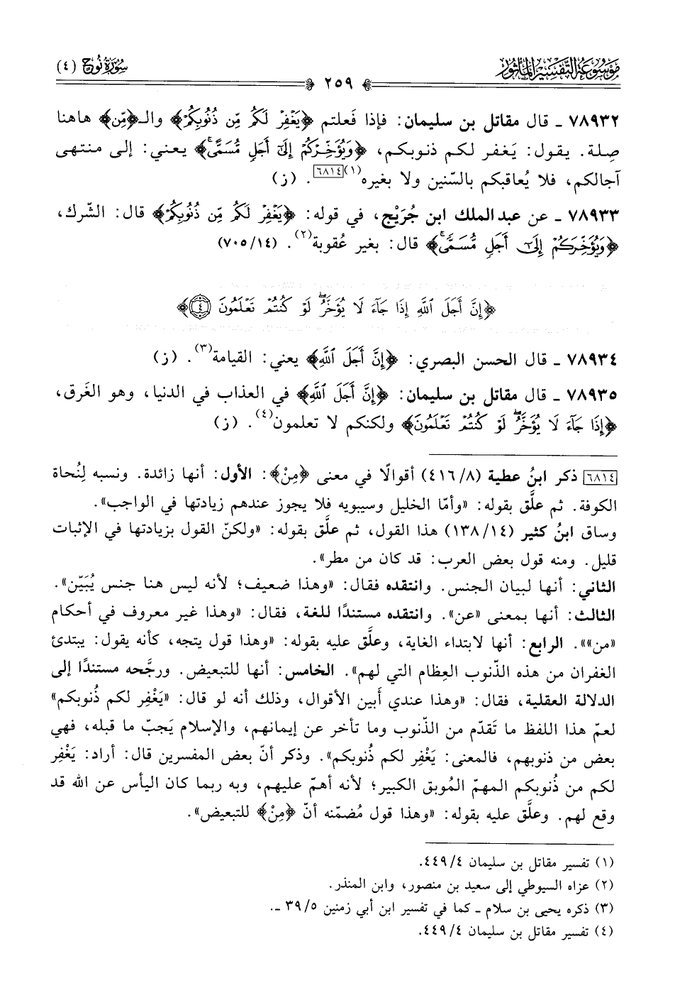 ٧٨٩٣٢ - قال مقاتل بن سليمان: فإذا فَعلتم {يَغْفِرْ لَكُمْ مِن ذُنُوبِكُمْ} والـ {من} هاهنا صِلة. يقول: يَغفر لكم ذنوبكم، {ويُؤَخِّرْكُمْ إلى أجَلٍ مُسَمًّى} يعني: إلى منتهى آجالكم، فلا يُعاقبكم بالسّنين ولا بغيره (¬١) [٦٨١٤]. (ز)