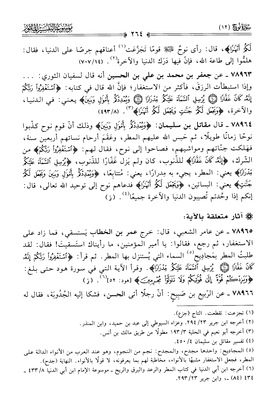 ٧٨٩٦٣ - عن جعفر بن محمد بن علي بن الحسين أنه قال لسفيان الثوري: ... وإذا استبطأت الرزقَ، فأكثر من الاستغفار؛ فإنّ الله قال في كتابه: {استغفروا ربَّكم إنّه كانَ غفّارا * يُرسل السماءَ عليكم مدرارًا * ويُمددكم بأموالٍ وبنينَ} يعني: في الدنيا، والآخرة، {ويجعل لكُم جناتٍ ويجعل لكم أنهارًا} (¬٣). (٨/ ٤٩٣)