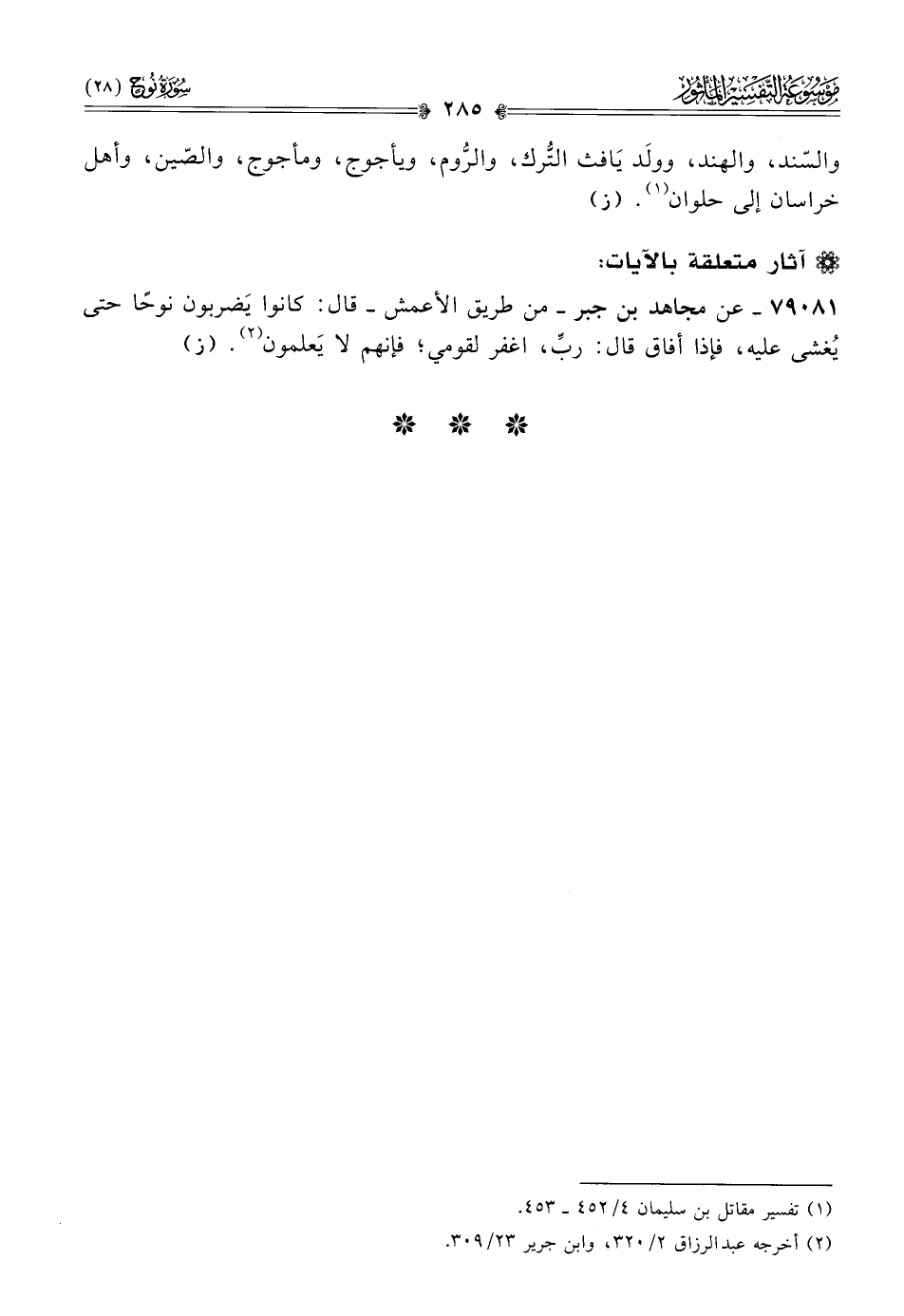 ٧٩٠٨١ - عن مجاهد بن جبر -من طريق الأعمش- قال: كانوا يَضربون نوحًا حتى يُغشى عليه، فإذا أفاق قال: ربِّ، اغفر لقومي؛ فإنهم لا يَعلمون (¬٢). (ز)