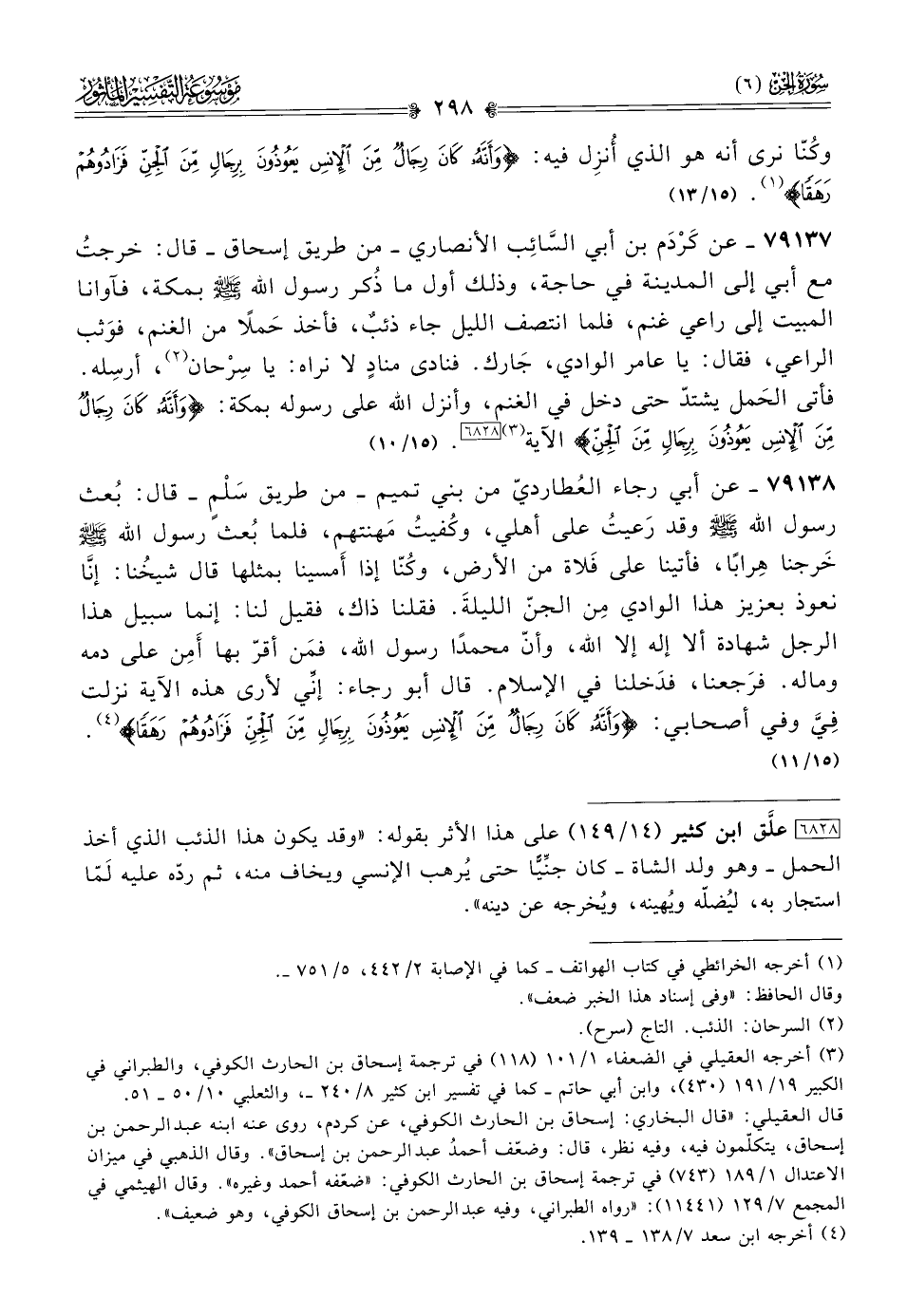 ٧٩١٣٧ - عن كَرْدَم بن أبي السّائِب الأنصاري -من طريق إسحاق- قال: خرجتُ مع أبي إلى المدينة في حاجة، وذلك أول ما ذُكر رسول الله - صلى الله عليه وسلم - بمكة، فآوانا المبيت إلى راعي غنم، فلما انتصف الليل جاء ذئبٌ، فأخذ حَملًا من الغنم، فوَثب الراعي، فقال: يا عامر الوادي، جارك. فنادى منادٍ لا نراه: يا سِرْحان (¬٢)، أرسِله. فأتى الحَمل يشتدّ حتى دخل في الغنم، وأنزل الله على رسوله بمكة: {وأَنَّهُ كانَ رِجالٌ مِنَ الإنْسِ يَعُوذُونَ بِرِجالٍ مِنَ الجنّ} الآية (¬٣) [٦٨٢٨]. (١٥/ ١٠)