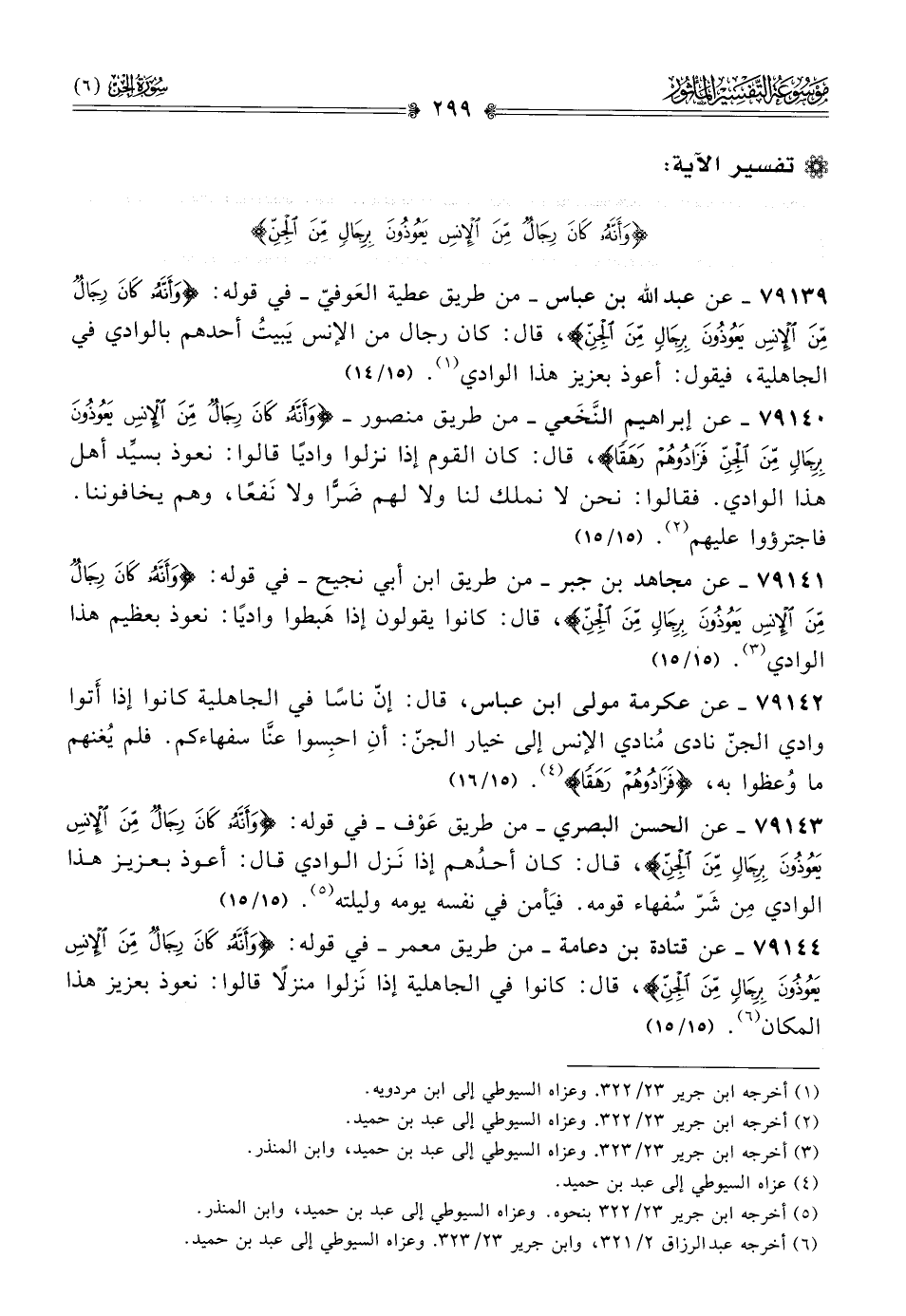 ٧٩١٤٢ - عن عكرمة مولى ابن عباس، قال: إنّ ناسًا في الجاهلية كانوا إذا أتوا وادي الجنّ نادى مُنادي الإنس إلى خيار الجنّ: أنِ احبِسوا عنّا سفهاءكم. فلم يُغنهم ما وُعظوا به، {فَزادُوهُمْ رَهَقًا} (¬٤). (١٥/ ١٦)