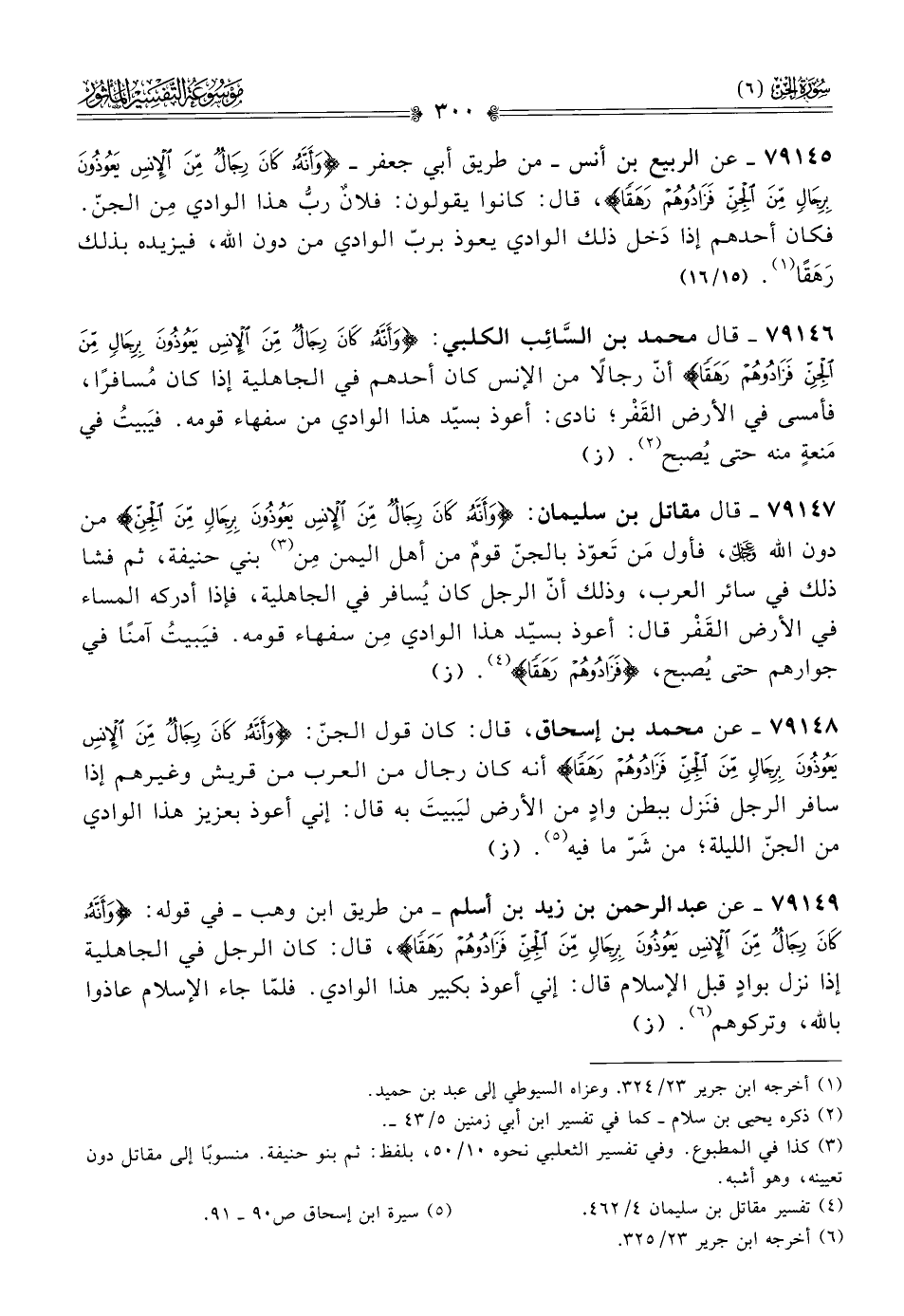 ٧٩١٤٥ - عن الربيع بن أنس -من طريق أبي جعفر- {وأَنَّهُ كانَ رِجالٌ مِنَ الإنْسِ يَعُوذُونَ بِرِجالٍ مِنَ الجنّ فَزادُوهُمْ رَهَقًا}، قال: كانوا يقولون: فلانٌ ربُّ هذا الوادي مِن الجنّ. فكان أحدهم إذا دَخل ذلك الوادي يعوذ بربّ الوادي من دون الله، فيزيده بذلك رَهَقًا (¬١). (١٥/ ١٦)