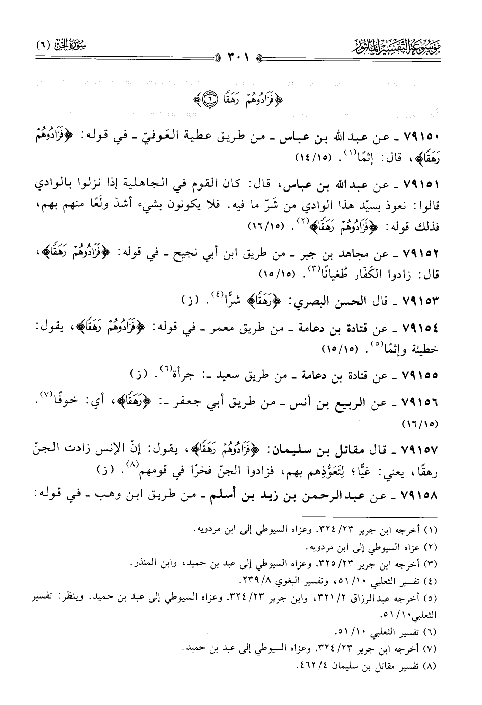 ٧٩١٥٠ - عن عبد الله بن عباس -من طريق عطية العَوفيّ- في قوله: {فَزادُوهُمْ رَهَقًا}، قال: إثمًا (¬١). (١٥/ ١٤)