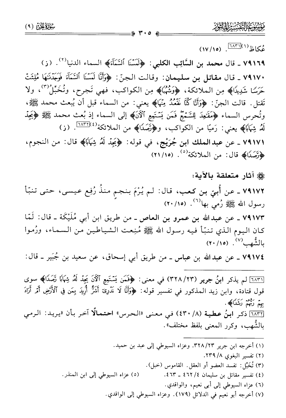٧٩١٦٩ - قال محمد بن السّائِب الكلبي: {لَمَسْنا السَّماءَ} السماء الدنيا (¬٢). (ز)