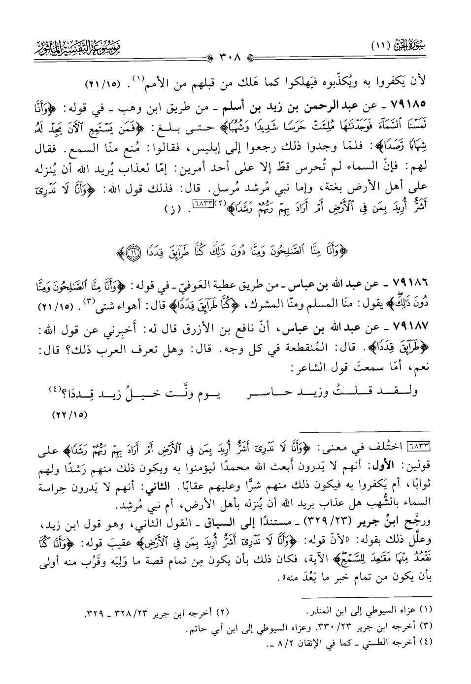 ٧٩١٨٥ - عن عبد الرحمن بن زيد بن أسلم -من طريق ابن وهب- في قوله: {وأَنّا لَمَسْنا السَّماءَ فَوَجَدْناها مُلِئَتْ حَرَسًا شَدِيدًا وشُهُبًا} حتى بلغ: {فَمَن يَسْتَمِعِ الآنَ يَجِدْ لَهُ شِهابًا رَصَدًا}: فلمّا وجدوا ذلك رجعوا إلى إبليس، فقالوا: مُنع منّا السمع. فقال لهم: فإنّ السماء لم تُحرس قطّ إلا على أحد أمرين: إمّا لعذاب يُريد الله أن يُنزله على أهل الأرض بغتة، وإما نبي مُرشد مُرسل. قال: فذلك قول الله: {وأَنّا لا نَدْرِي أشَرٌّ أُرِيدَ بِمَن فِي الأَرْضِ أمْ أرادَ بِهِمْ رَبُّهُمْ رَشَدًا} (¬٢) [٦٨٣٣]. (ز)