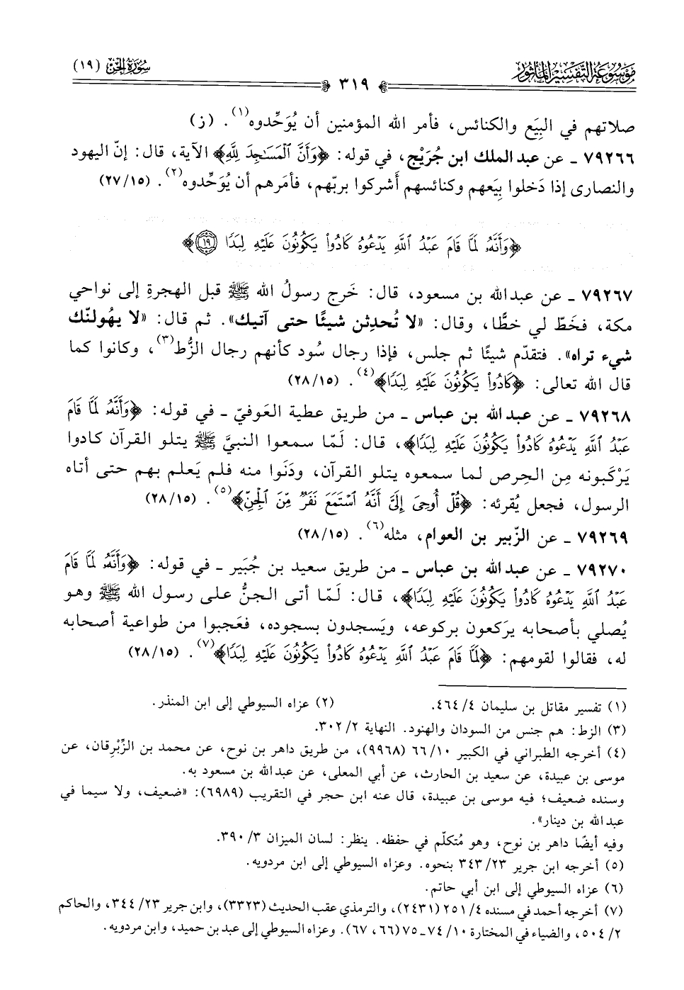 ٧٩٢٦٨ - عن عبد الله بن عباس -من طريق عطية العَوفيّ- في قوله: {وأَنَّهُ لَمّا قامَ عَبْدُ اللَّهِ يَدْعُوهُ كادُوا يَكُونُونَ عَلَيْهِ لِبَدًا}، قال: لَمّا سمعوا النبيَّ - صلى الله عليه وسلم - يتلو القرآن كادوا يَرْكَبونه مِن الحِرص لما سمعوه يتلو القرآن، ودَنَوا منه فلم يَعلم بهم حتى أتاه الرسول، فجعل يُقرئه: {قُلْ أُوحِيَ إلَيَّ أنَّهُ اسْتَمَعَ نَفَرٌ مِنَ الجنّ} (¬٥). (١٥/ ٢٨)