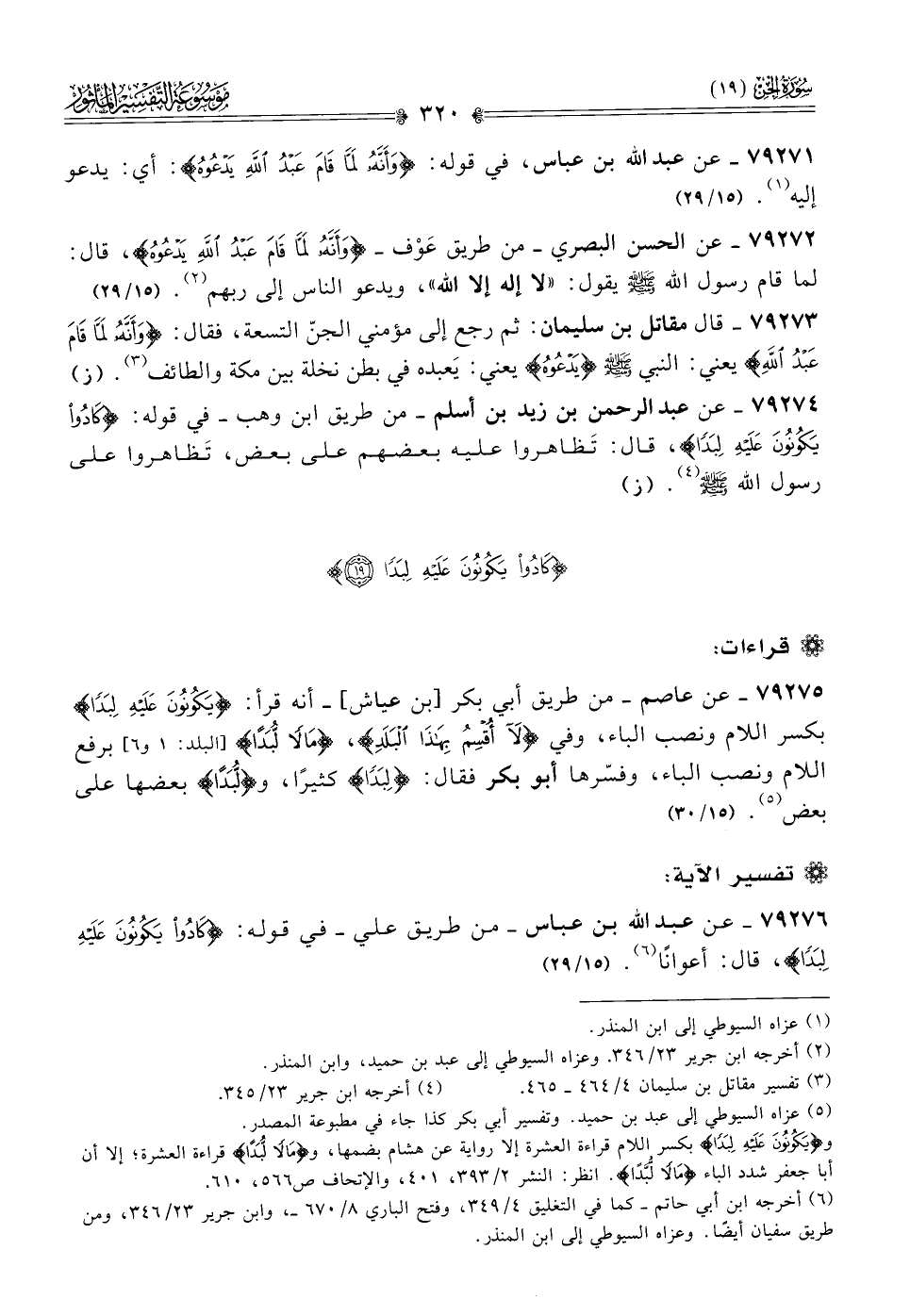 ٧٩٢٧١ - عن عبد الله بن عباس، في قوله: {وأَنَّهُ لَمّا قامَ عَبْدُ اللَّهِ يَدْعُوهُ}: أي: يدعو إليه (¬١). (١٥/ ٢٩)