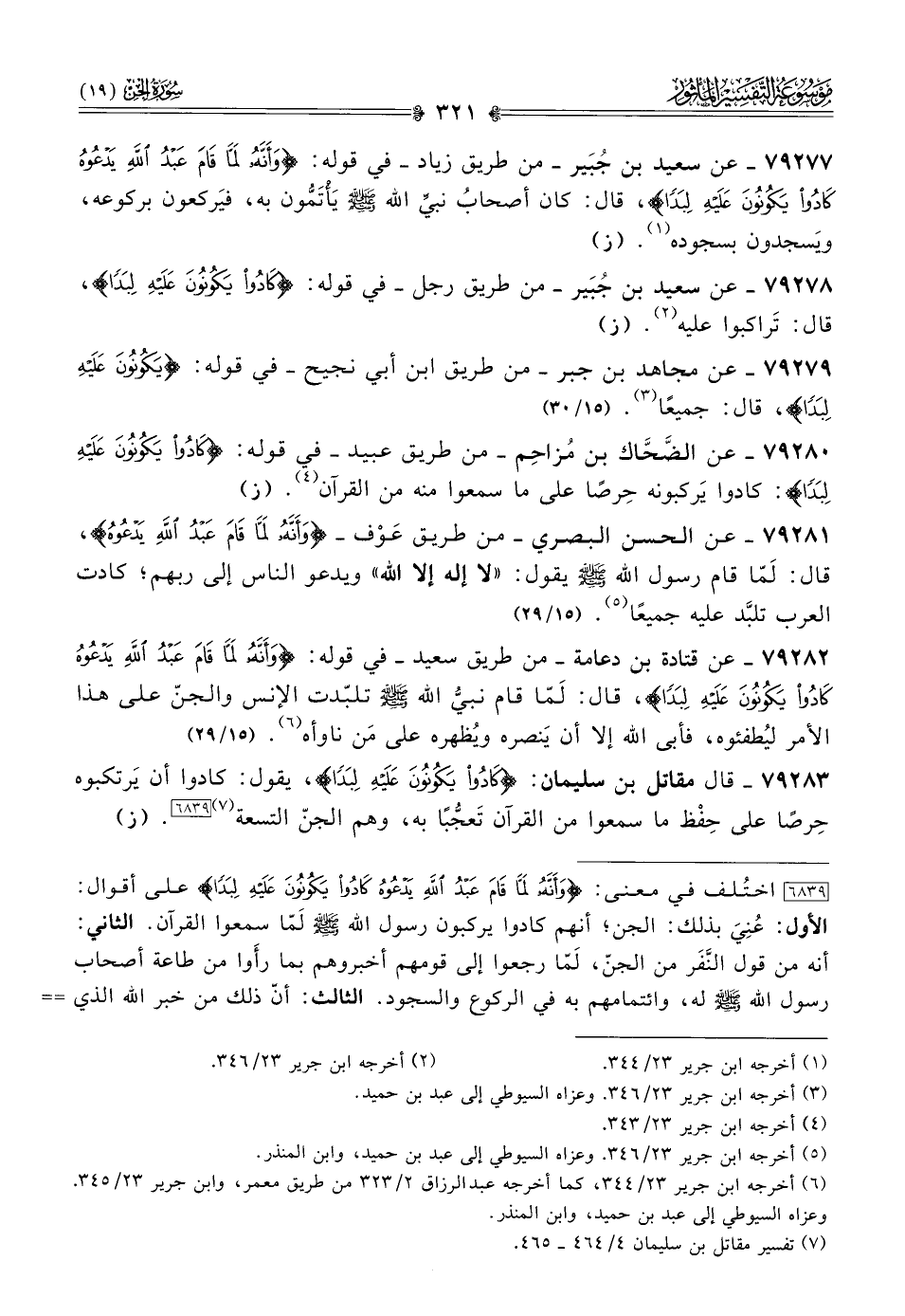 ٧٩٢٧٩ - عن مجاهد بن جبر -من طريق ابن أبي نجيح- في قوله: {يَكُونُونَ عَلَيْهِ لِبَدًا}، قال: جميعًا (¬٣). (١٥/ ٣٠)