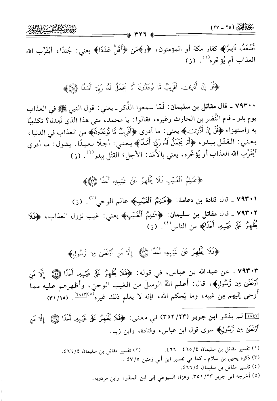 ٧٩٣٠٢ - قال مقاتل بن سليمان: {عالِمُ الغَيْبِ} يعني: غيب نزول العذاب، {فَلا يُظْهِرُ عَلى غَيْبِهِ أحدًا} من الناس (¬٤). (ز)