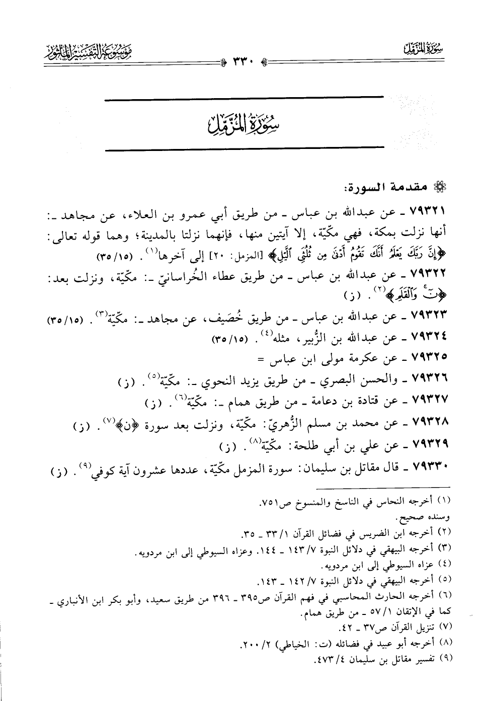 ٧٩٣٣٠ - قال مقاتل بن سليمان: سورة المزمل مكّيّة، عددها عشرون آية كوفي (¬٩). (ز)