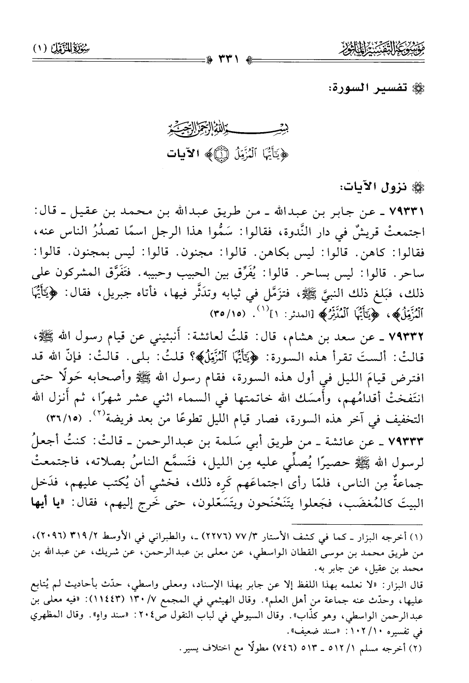 ٧٩٣٣١ - عن جابر بن عبد الله -من طريق عبد الله بن محمد بن عقيل- قال: اجتمعتْ قريشٌ في دار النَّدوة، فقالوا: سَمُّوا هذا الرجل اسمًا تصدُرُ الناس عنه، فقالوا: كاهن. قالوا: ليس بكاهن. قالوا: مجنون. قالوا: ليس بمجنون. قالوا: ساحر. قالوا: ليس بساحر. قالوا: يُفَرِّق بين الحبيب وحبيبه. فتَفَرَّق المشركون على ذلك، فبَلغ ذلك النبيَّ - صلى الله عليه وسلم -، فتزَمَّل في ثيابه وتدَثَّر فيها، فأتاه جبريل، فقال: {يا أيُّها المزمل}، {يا أيُّها المُدَّثِّرُ} [المدثر: ١] (¬١). (١٥/ ٣٥)