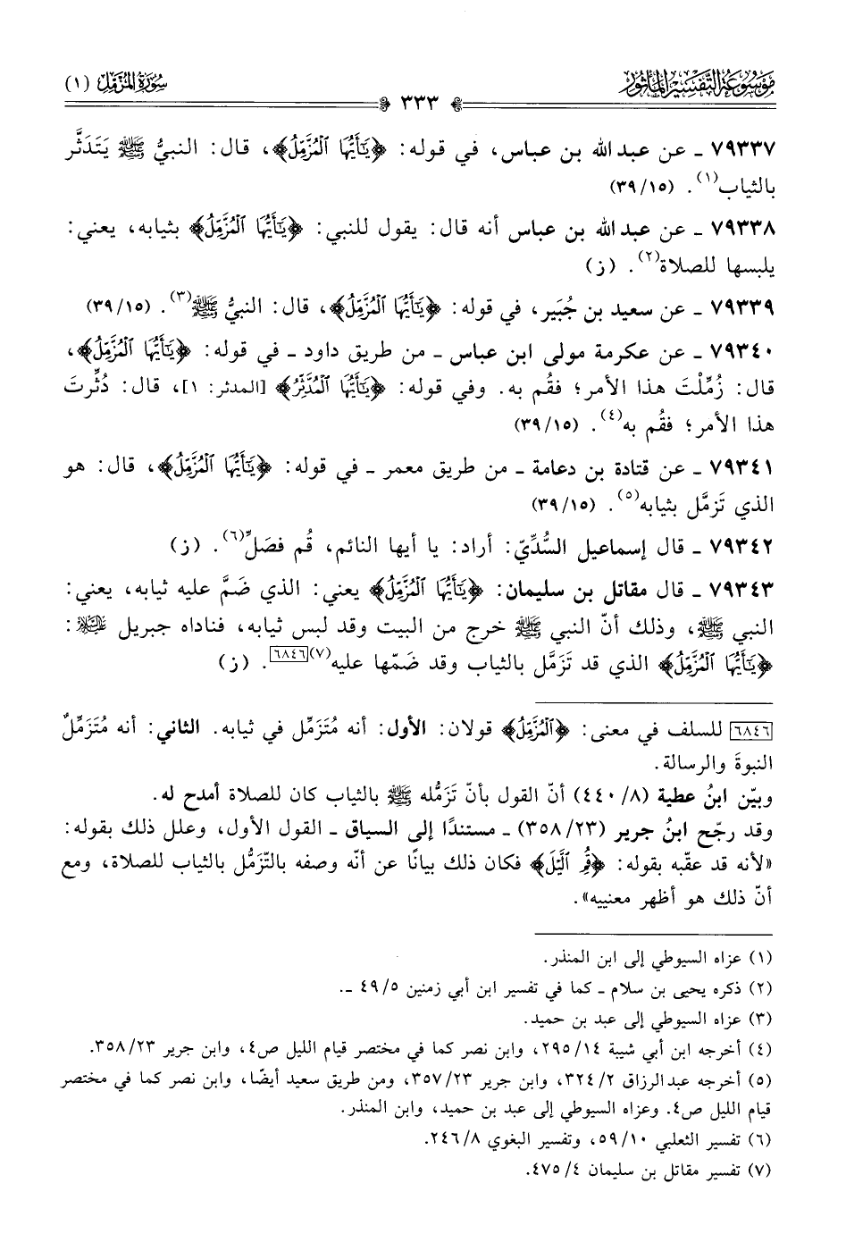 ٧٩٣٣٨ - عن عبد الله بن عباس أنه قال: يقول للنبي: {يا أيُّها المزمل} بثيابه، يعني: يلبسها للصلاة (¬٢). (ز)