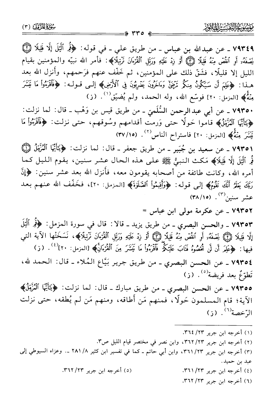 ٧٩٣٥١ - عن سعيد بن جُبَير -من طريق جعفر- قال: لما نزلت: {يا أيُّها المزمل * قُمِ اللَّيْلَ إلّا قَلِيلًا} مَكث النبيُّ - صلى الله عليه وسلم - على هذه الحال عشر سنين، يقوم الليل كما أمره الله، وكانت طائفة من أصحابه يقومون معه، فأَنزل الله بعد عشر سنين: {إن ربك يعلم أنك تقوم} إلى قوله: {وأَقِيمُوا الصَّلاةَ} [المزمل: ٢٠]، فخَفّف الله عنهم بعد عشر سنين (¬٣).