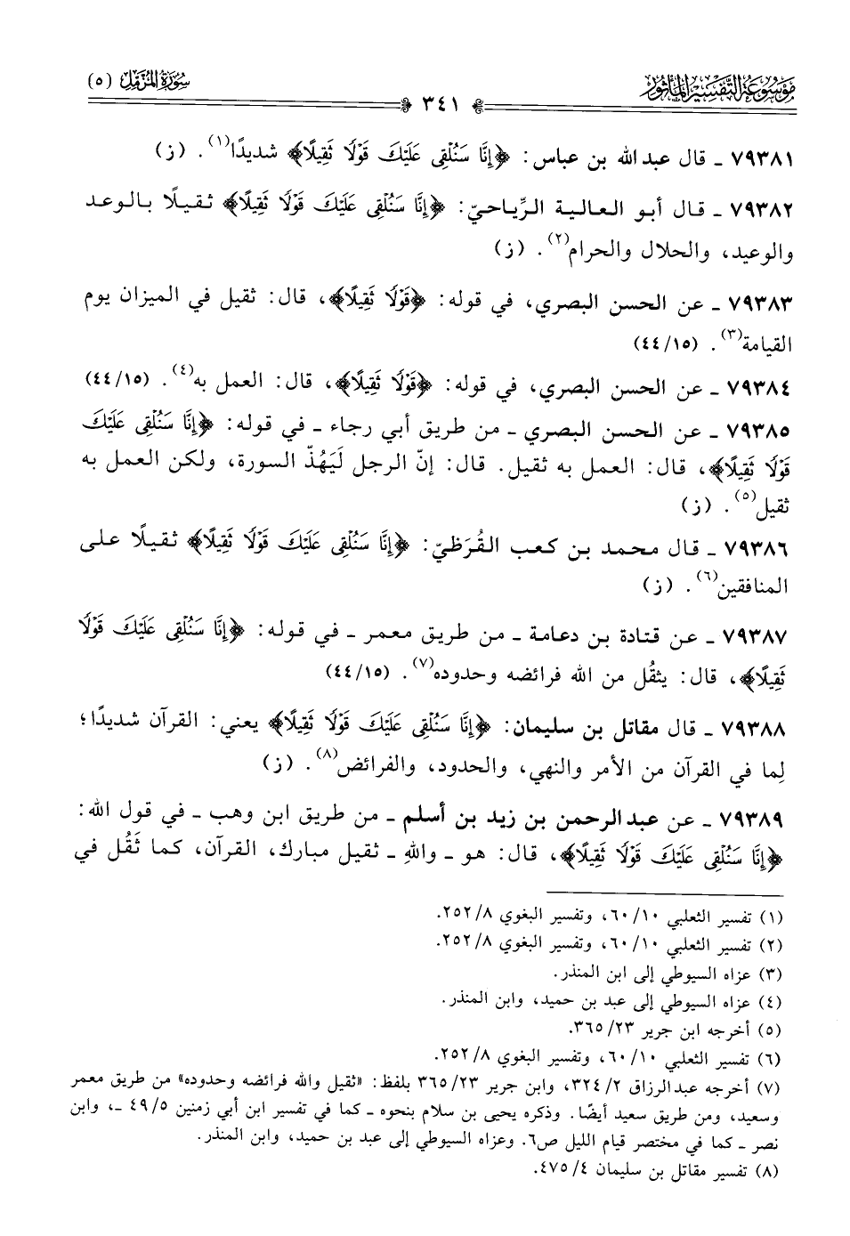 ٧٩٣٨٤ - عن الحسن البصري، في قوله: {قَوْلًا ثَقِيلًا}، قال: العمل به (¬٤). (١٥/ ٤٤)
