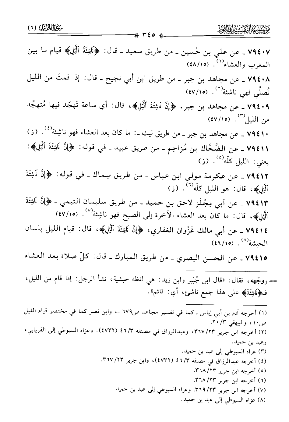 ٧٩٤١٤ - عن أبي مالك غَزْوان الغفاري، {إنَّ ناشِئَةَ اللَّيْلِ}، قال: قيام الليل بلسان الحبشة (¬٨). (١٥/ ٤٦)