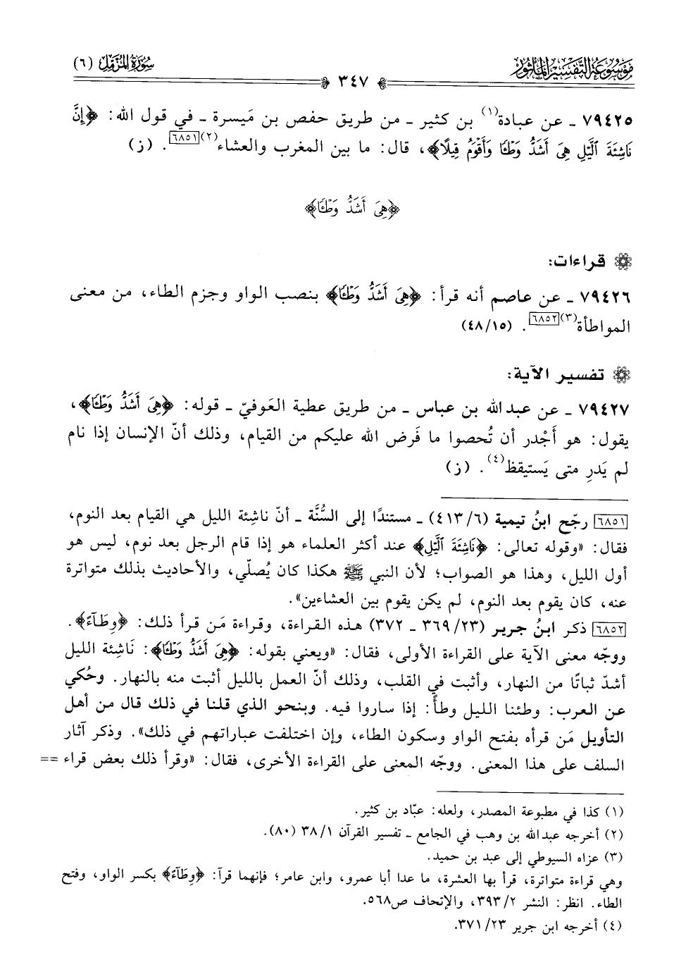٧٩٤٢٥ - عن عبادة (¬١) بن كثير -من طريق حفص بن مَيسرة- في قول الله: {إن ناشِئَةَ اللَّيْلِ هِيَ أشَدُّ وطئا وأَقْوَمُ قِيلًا}، قال: ما بين المغرب والعشاء (¬٢) [٦٨٥١]. (ز)