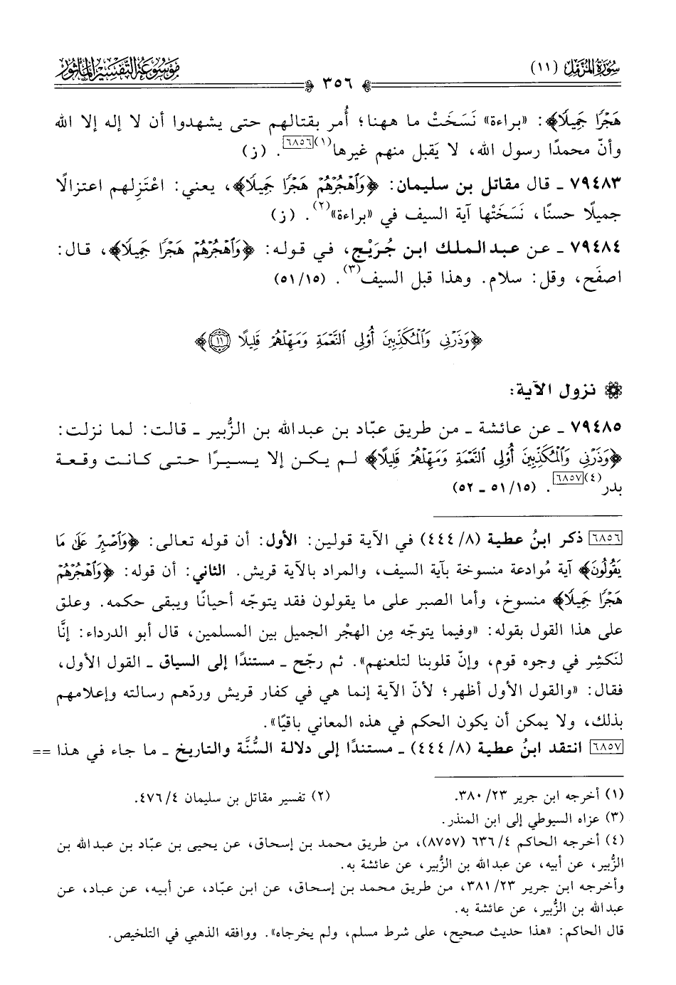 ٧٩٤٨٣ - قال مقاتل بن سليمان: {واهْجُرْهُمْ هَجْرًا جَمِيلًا}، يعني: اعْتَزِلهم اعتزالًا جميلًا حسنًا، نَسَخَتْها آية السيف في «براءة» (¬٢). (ز)