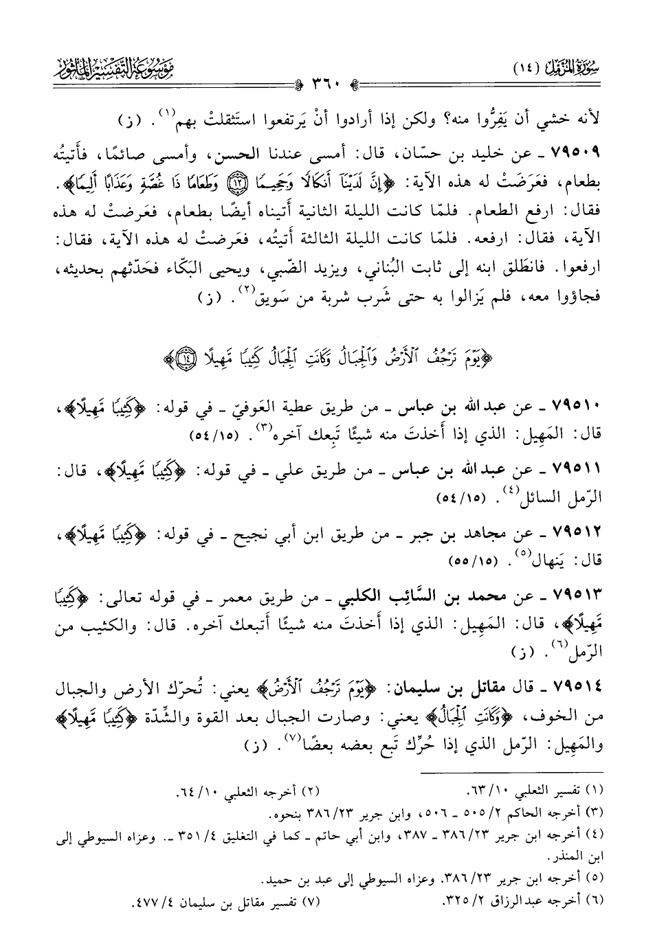 ٧٩٥١٤ - قال مقاتل بن سليمان: {يَوْمَ تَرْجُفُ الأَرْضُ} يعني: تُحرّك الأرض والجبال من الخوف، {وكانَتِ الجِبالُ} يعني: وصارت الجبال بعد القوة والشِّدّة {كَثِيبًا مَهِيلًا} والمَهِيل: الرّمل الذي إذا حُرِّك تَبع بعضه بعضًا (¬٧). (ز)