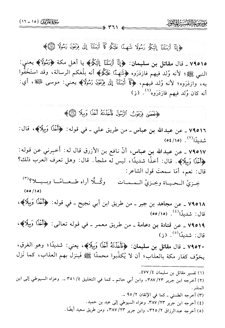 ٧٩٥٢٠ - قال مقاتل بن سليمان: {فَأَخَذْناهُ أخْذًا وبِيلًا}، يعني: شديدًا؛ وهو الغرق، يخوِّف كفار مكة بالعذاب؛ أن لا يُكذّبوا محمدًا - صلى الله عليه وسلم - فَينزل بهم العذاب، كما نَزل