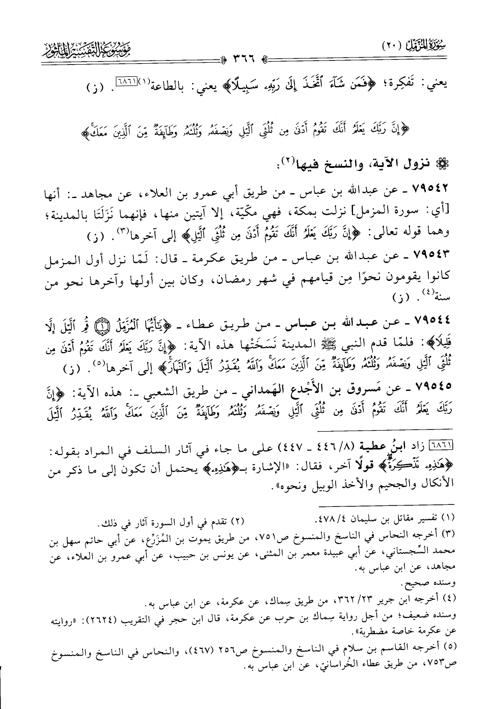٧٩٥٤٤ - عن عبد الله بن عباس -من طريق عطاء- {يا أيُّها المزمل قُمِ اللَّيْلَ إلّا قَلِيلًا}: فلمّا قدم النبي - صلى الله عليه وسلم - المدينة نَسَخَتْها هذه الآية: {إنَّ رَبَّكَ يَعْلَمُ أنَّكَ تَقُومُ أدْنى مِن ثُلُثَيِ اللَّيْلِ ونِصْفَهُ وثُلُثَهُ وطائِفَةٌ مِنَ الَّذِينَ مَعَكَ واللَّهُ يُقَدِّرُ اللَّيْلَ والنَّهارَ} إلى آخرها (¬٥). (ز)