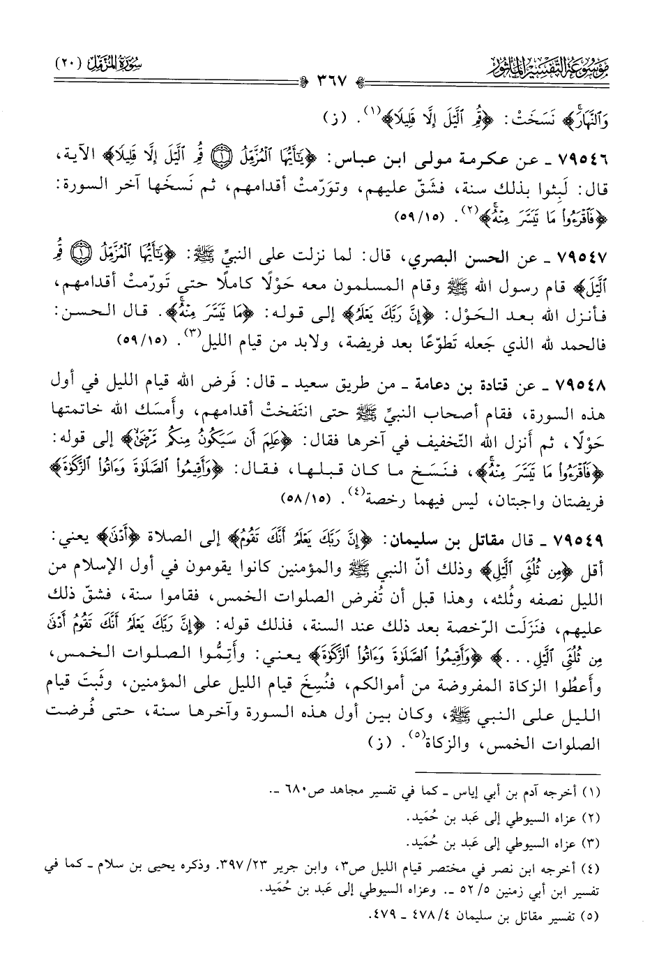 ٧٩٥٤٦ - عن عكرمة مولى ابن عباس: {يا أيُّها المزمل قُمِ اللَّيْلَ إلّا قَلِيلًا} الآية، قال: لَبِثوا بذلك سنة، فشَقّ عليهم، وتوَرّمتْ أقدامهم، ثم نَسخَها آخر السورة: {فاقْرَءُوا ما تَيَسَّرَ مِنهُ} (¬٢). (١٥/ ٥٩)