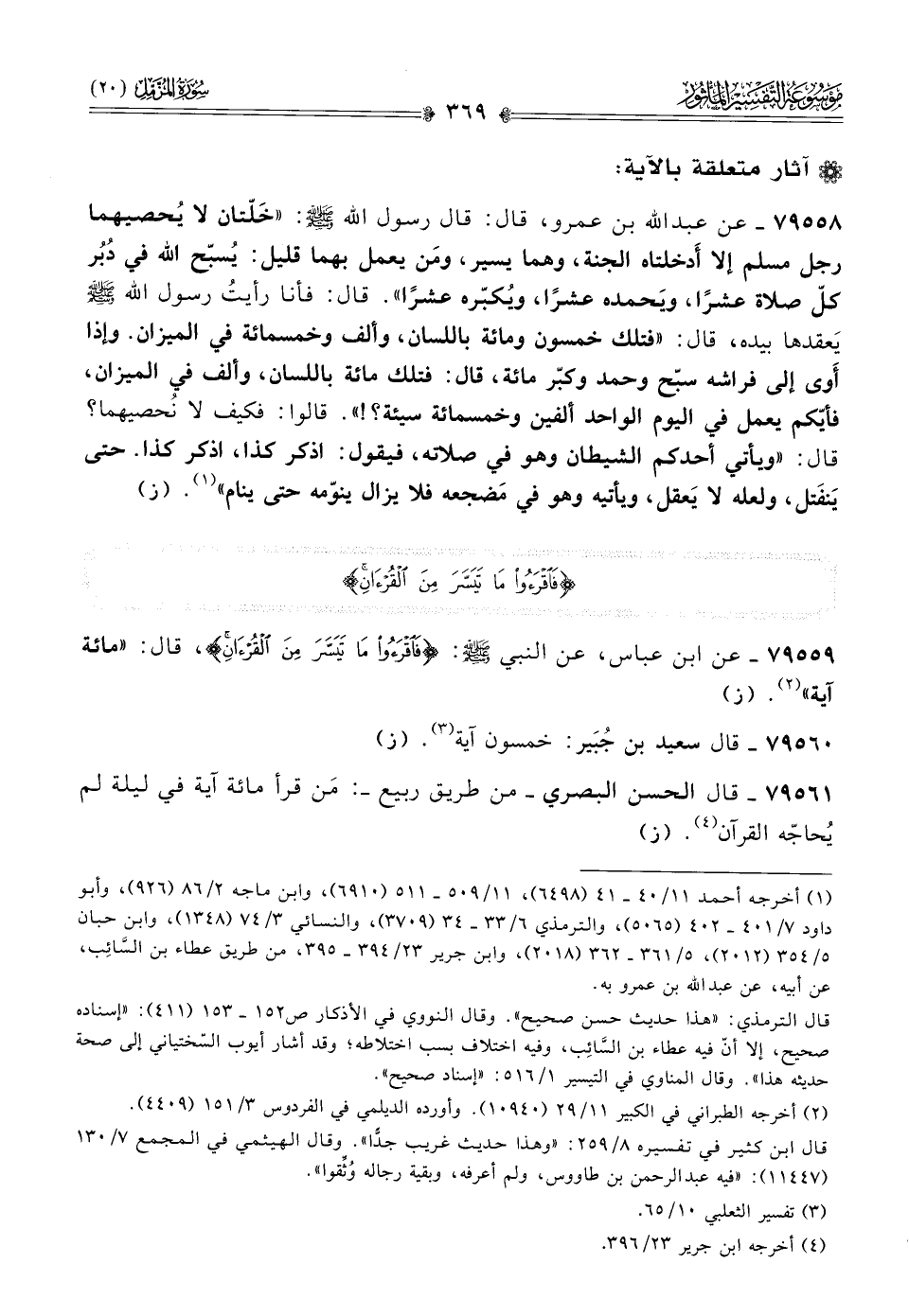 ٧٩٥٥٨ - عن عبد الله بن عمرو، قال: قال رسول الله - صلى الله عليه وسلم -: «خَلّتان لا يُحصيهما رجل مسلم إلا أدخلتاه الجنة، وهما يسير، ومَن يعمل بهما قليل: يُسبّح الله في دُبُر كلّ صلاة عشرًا، ويَحمده عشرًا، ويُكبّره عشرًا». قال: فأنا رأيتُ رسول الله - صلى الله عليه وسلم - يَعقدها بيده، قال: «فتلك خمسون ومائة باللسان، وألف وخمسمائة في الميزان. وإذا أوى إلى فراشه سبّح وحمد وكبّر مائة، قال: فتلك مائة باللسان، وألف في الميزان، فأيّكم يعمل في اليوم الواحد ألفين وخمسمائة سيئة؟!». قالوا: فكيف لا نُحصيهما؟ قال: «ويأتي أحدكم الشيطان وهو في صلاته، فيقول: اذكر كذا، اذكر كذا. حتى يَنفَتل، ولعله لا يَعقل، ويأتيه وهو في مَضجعه فلا يزال ينوّمه حتى ينام» (¬١). (ز)