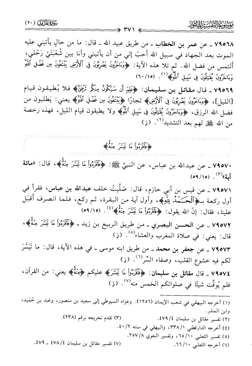 ٧٩٥٧٤ - قال مقاتل بن سليمان: {فاقْرَءُوا ما تَيَسَّرَ} عليكم {مِنهُ} يعني: من القرآن، فلم يُوقِّت شيئًا في صلواتكم الخمس منه (¬٧). (ز)