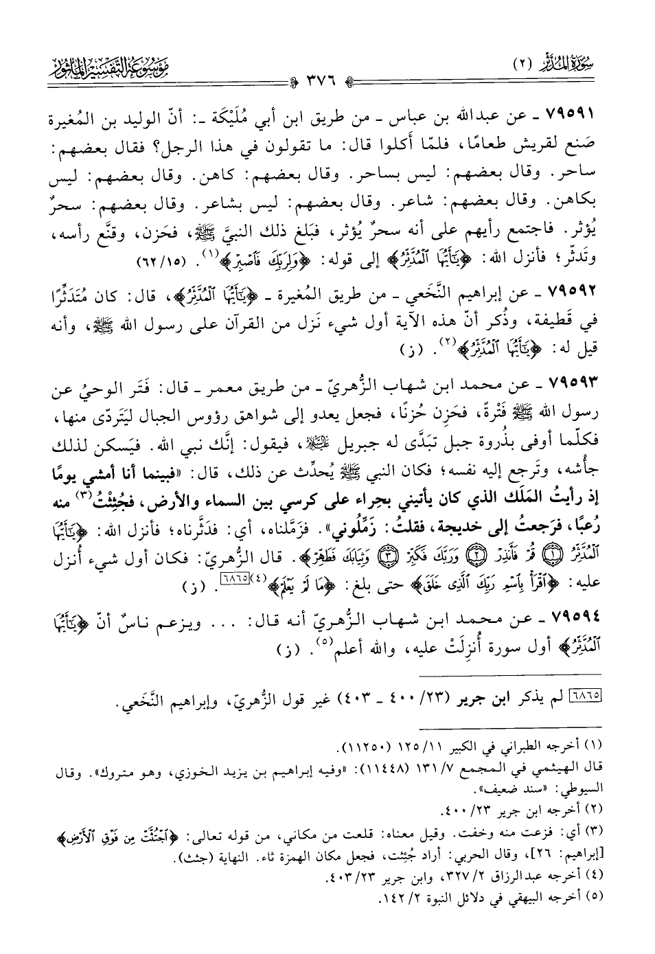 ٧٩٥٩٤ - عن محمد ابن شهاب الزُّهريّ أنه قال: ... ويزعم ناسٌ أنّ {يا أيها المُدَّثِّر} أول سورة أُنزِلَتْ عليه، والله أعلم (¬٥). (ز)