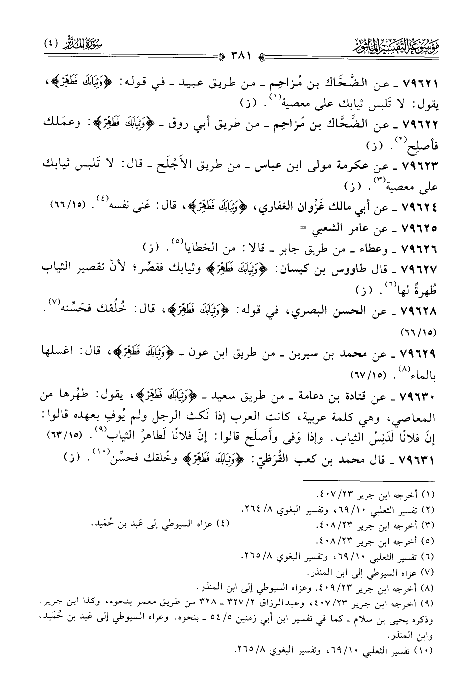 ٧٩٦٢٧ - قال طاووس بن كيسان: {وثِيابَكَ فَطَهِّرْ} وثيابك فقصِّر؛ لأنّ تقصير الثياب طُهرةٌ لها (¬٦). (ز)