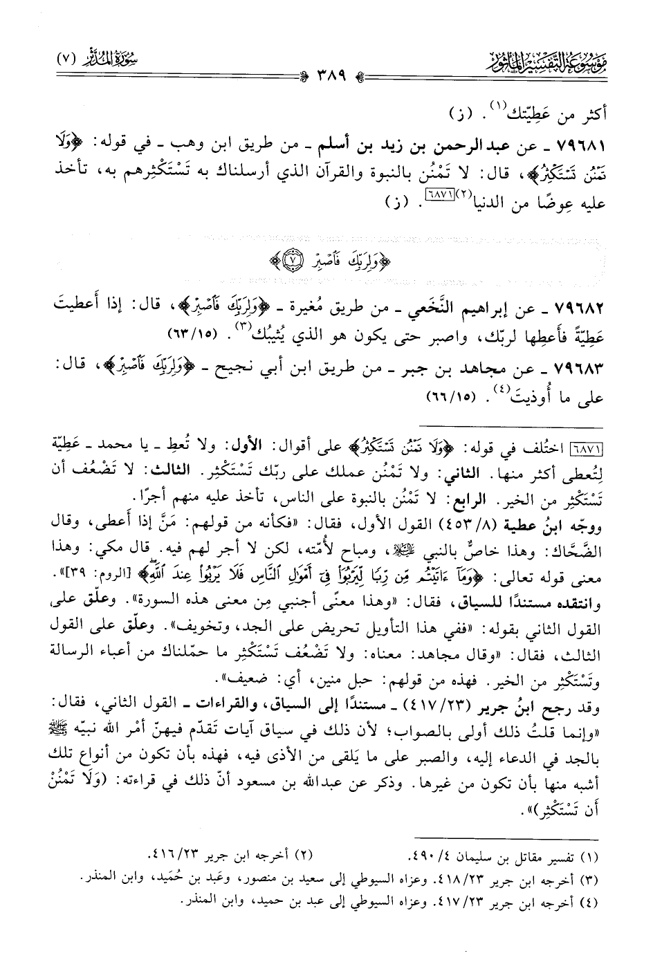[٦٨٧١] اختُلف في قوله: {ولا تمنن تستكثر} على أقوال: الأول: ولا تُعطِ -يا محمد- عَطِيّة لِتُعطى أكثر منها. الثاني: ولا تَمْنُن عملك على ربّك تَسْتَكْثِر. الثالث: لا تَضْعُف أن تَسْتَكْثِر من الخير. الرابع: لا تَمْنُن بالنبوة على الناس، تأخذ عليه منهم أجرًا.