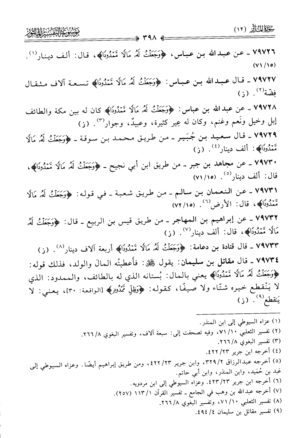 ٧٩٧٢٧ - قال عبد الله بن عباس: {وجَعَلْتُ لَهُ مالًا مَمْدُودًا} تسعة آلاف مثقال فِضّة (¬٢). (ز)