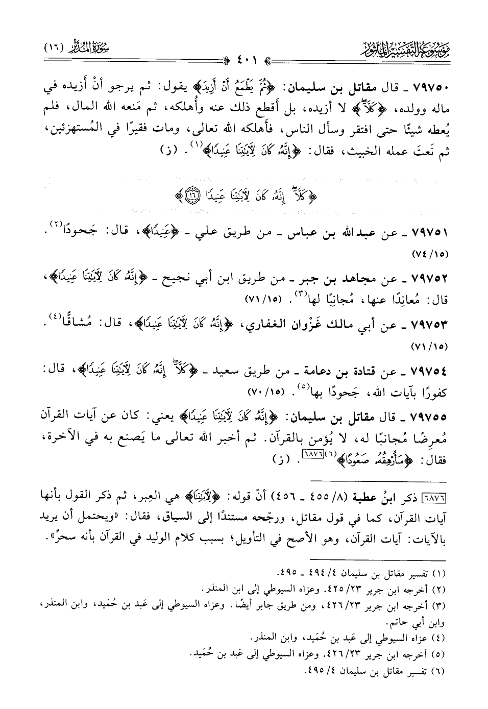 ٧٩٧٥٤ - عن قتادة بن دعامة -من طريق سعيد- {كَلّا إنَّهُ كانَ لِآياتِنا عَنِيدًا}، قال: كفورًا بآيات الله، جَحودًا بها (¬٥). (١٥/ ٧٠)