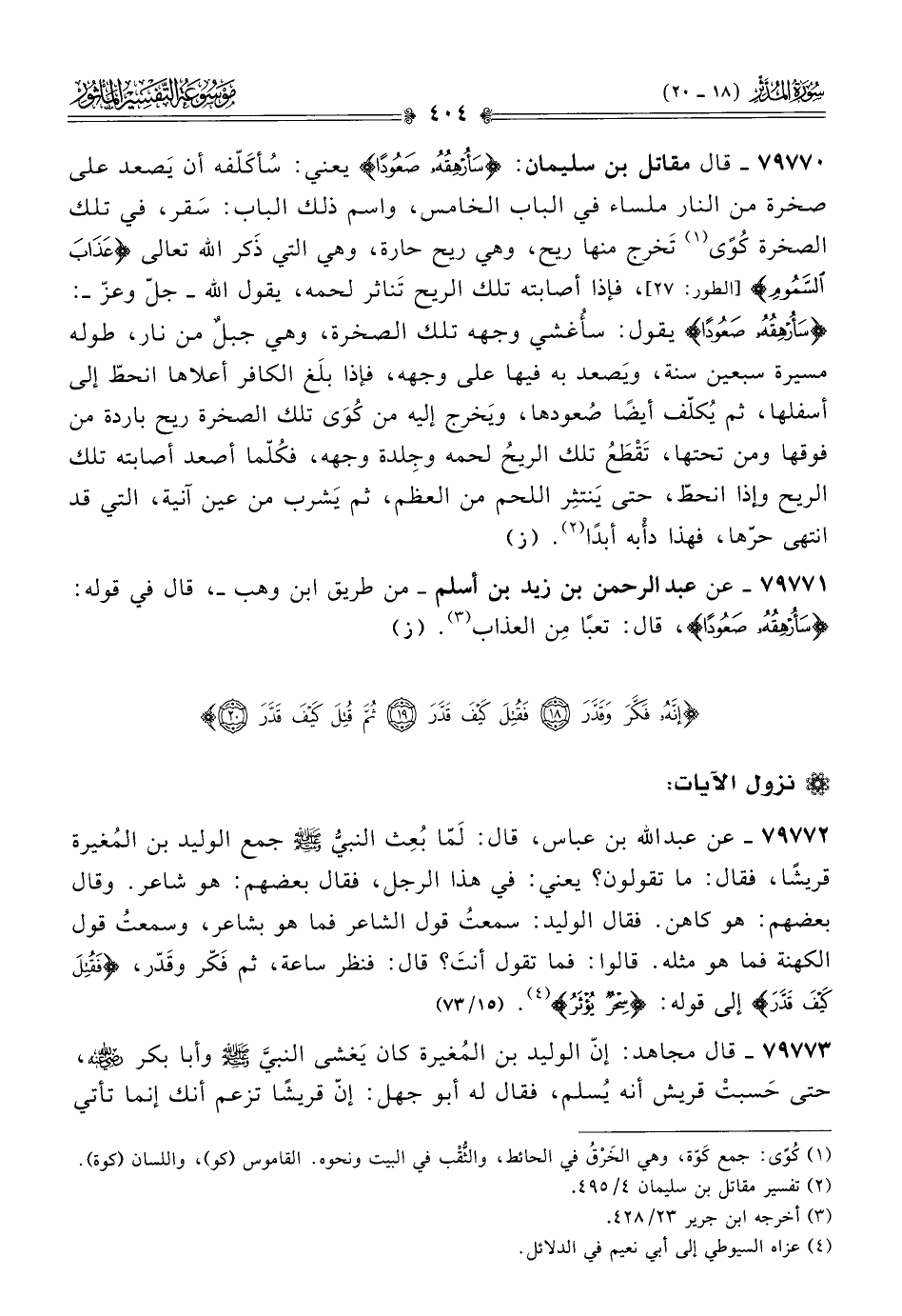 ٧٩٧٧٢ - عن عبد الله بن عباس، قال: لَمّا بُعِث النبيُّ - صلى الله عليه وسلم - جمع الوليد بن المُغيرة قريشًا، فقال: ما تقولون؟ يعني: في هذا الرجل، فقال بعضهم: هو شاعر. وقال بعضهم: هو كاهن. فقال الوليد: سمعتُ قول الشاعر فما هو بشاعر، وسمعتُ قول الكهنة فما هو مثله. قالوا: فما تقول أنتَ؟ قال: فنظر ساعة، ثم فَكّر وقَدّر، {فَقُتِلَ كَيْفَ قَدَّرَ} إلى قوله: {سِحْرٌ يُؤْثَرُ} (¬٤). (١٥/ ٧٣)