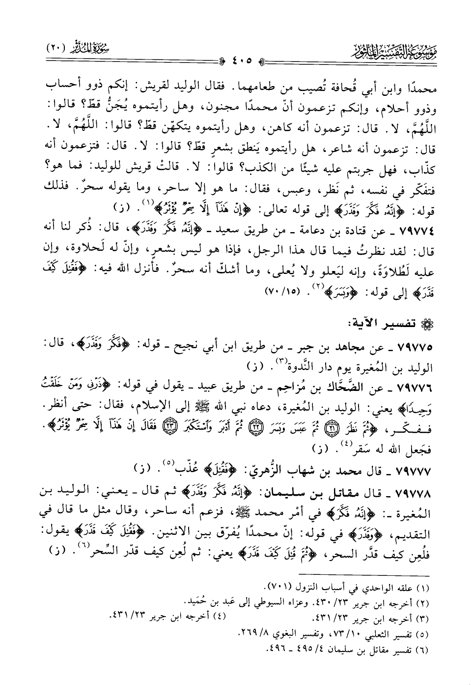 ٧٩٧٧٥ - عن مجاهد بن جبر -من طريق ابن أبي نجيح- قوله: {فَكَّرَ وقَدَّرَ}، قال: الوليد بن المُغيرة يوم دار النَّدوة (¬٣). (ز)