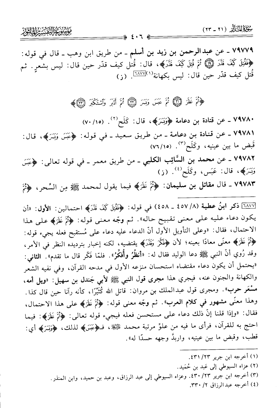 ٧٩٧٧٩ - عن عبد الرحمن بن زيد بن أسلم -من طريق ابن وهب- قال في قوله: {فَقُتِلَ كَيْفَ قَدَّرَ ثُمَّ قُتِلَ كَيْفَ قَدَّرَ}، قال: قُتل كيف قدّر حين قال: ليس بشعرٍ. ثم قُتل كيف قدّر حين قال: ليس بكهانة (¬١) [٦٨٧٧]. (ز)