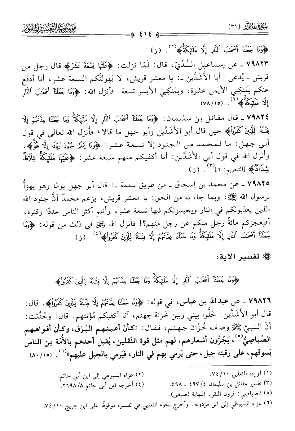 ٧٩٨٢٥ - عن محمد بن إسحاق -من طريق سلمة-: قال أبو جهل يومًا وهو يهزأُ برسول الله - صلى الله عليه وسلم -، وبما جاء به من الحق: يا معشر قريش، يزعم محمدٌ أنّ جنود الله الذين يعذبونكم في النار ويحبسونكم فيها تسعة عشر، وأنتم أكثر الناس عددًا وكثرة، أفيعجزكم مائةُ رجل منكم عن رجل منهم؟! فأنزل الله - عز وجل - في ذلك من قوله: {وما جعلنا أصحاب النار إلا ملائكة وما جعلنا عدتهم إلا فتنة للذين كفروا} (¬٤). (ز)