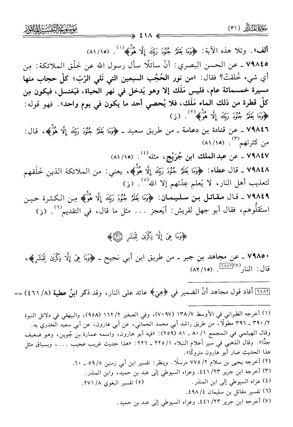 ٧٩٨٤٨ - قال عطاء: {وما يَعْلَمُ جُنُودَ رَبِّكَ إلّا هُوَ}، يعني: من الملائكة الذين خَلَقهم لتعذيب أهل النار، لا يَعلم عِدّتهم إلا الله (¬٥). (ز)