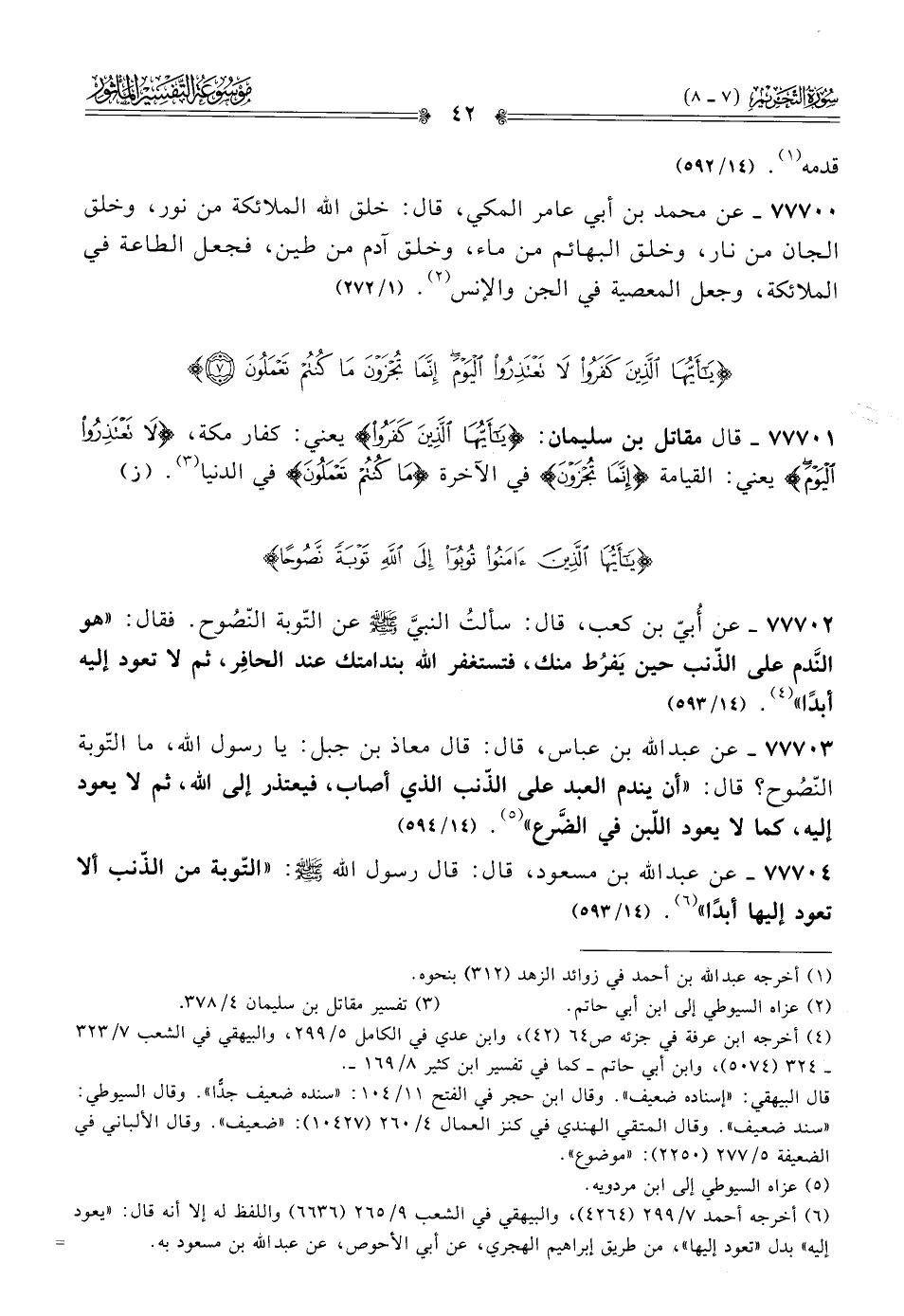٧٧٧٠٤ - عن عبد الله بن مسعود، قال: قال رسول الله - صلى الله عليه وسلم -: «التّوبة من الذّنب ألا تعود إليها أبدًا» (¬٦). (١٤/ ٥٩٣)
