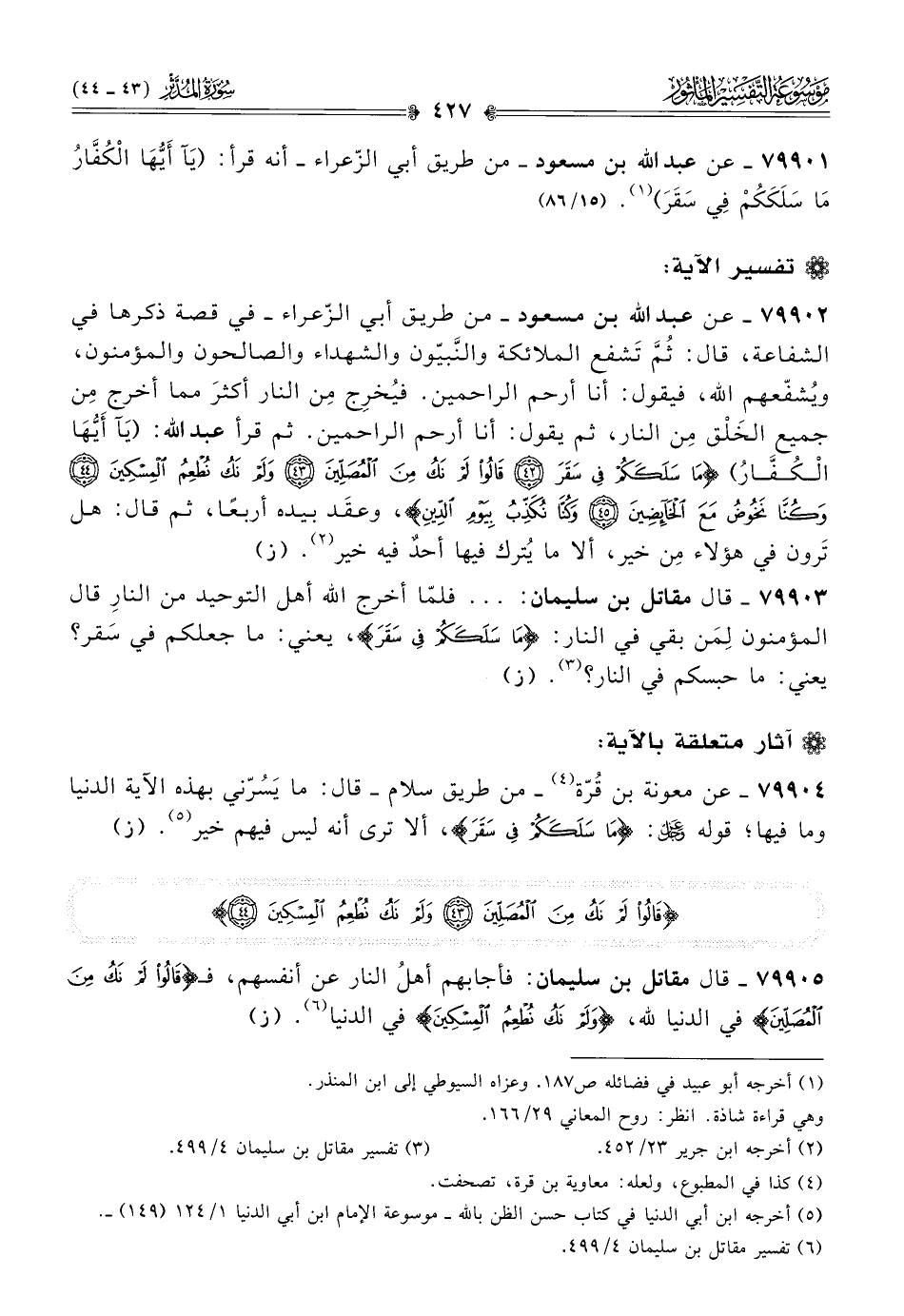 ٧٩٩٠١ - عن عبد الله بن مسعود -من طريق أبي الزّعراء- أنه قرأ: (يَآ أيُّها الكُفّارُ ما سَلَكَكُمْ فِي سَقَرَ) (¬١). (١٥/ ٨٦)