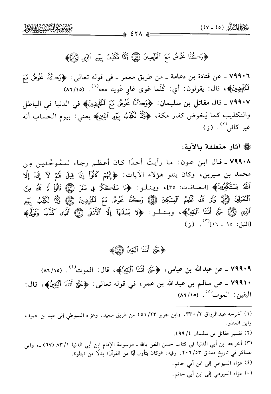 ٧٩٩٠٦ - عن قتادة بن دعامة -من طريق معمر- في قوله تعالى: {وكُنّا نَخُوضُ مَعَ الخائِضِينَ}، قال: يقولون: أي: كُلّما غوى غاوٍ غَوينا معه (¬١). (١٥/ ٨٦)
