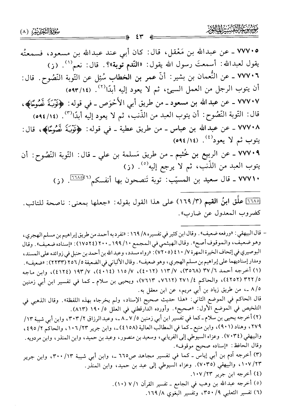 ٧٧٧٠٧ - عن عبد الله بن مسعود -من طريق أبي الأَحْوَص- في قوله: {تَوْبَةً نَصُوحًا}، قال: التّوبة النّصُوح: أن يتوب العبد من الذّنب، ثم لا يعود إليه أبدًا (¬٣). (١٤/ ٥٩٤)