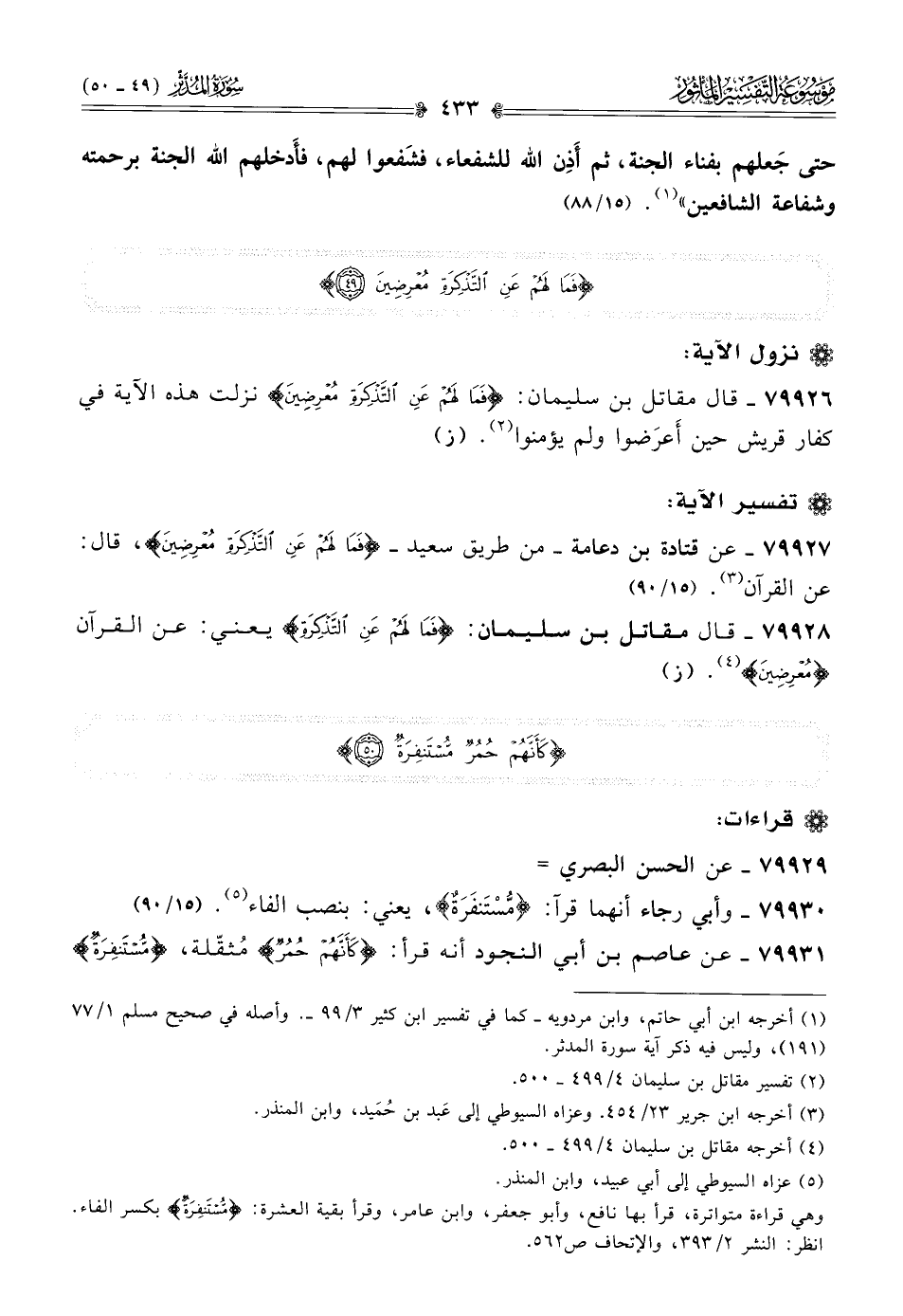 ٧٩٩٢٨ - قال مقاتل بن سليمان: {فَما لَهُمْ عَنِ التَّذْكِرَةِ} يعني: عن القرآن {مُعرِضين} (¬٤). (ز)