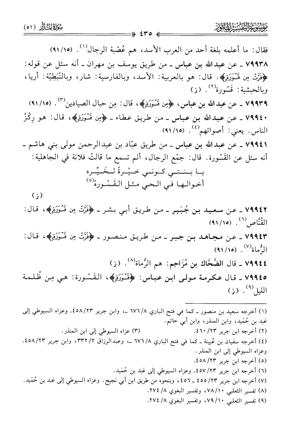 ٧٩٩٤٢ - عن سعيد بن جُبَير -من طريق أبي بشر- {فَرَّتْ مِن قَسْوَرَةٍ}، قال: القُنّاص (¬٦). (١٥/ ٩١)