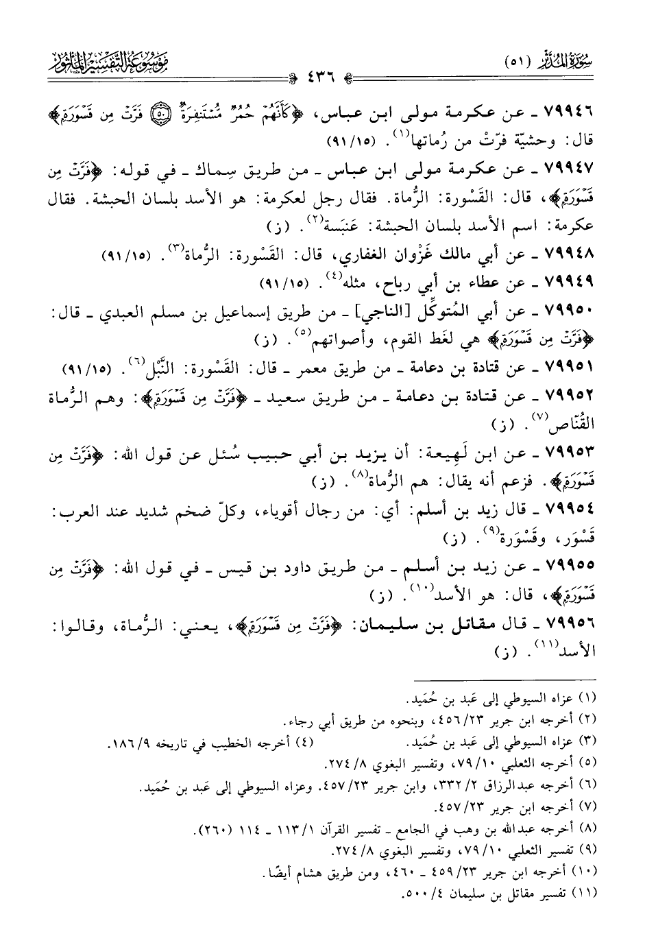 ٧٩٩٥٦ - قال مقاتل بن سليمان: {فَرَّتْ مِن قَسْوَرَةٍ}، يعني: الرُّماة، وقالوا: الأسد (¬١١). (ز)