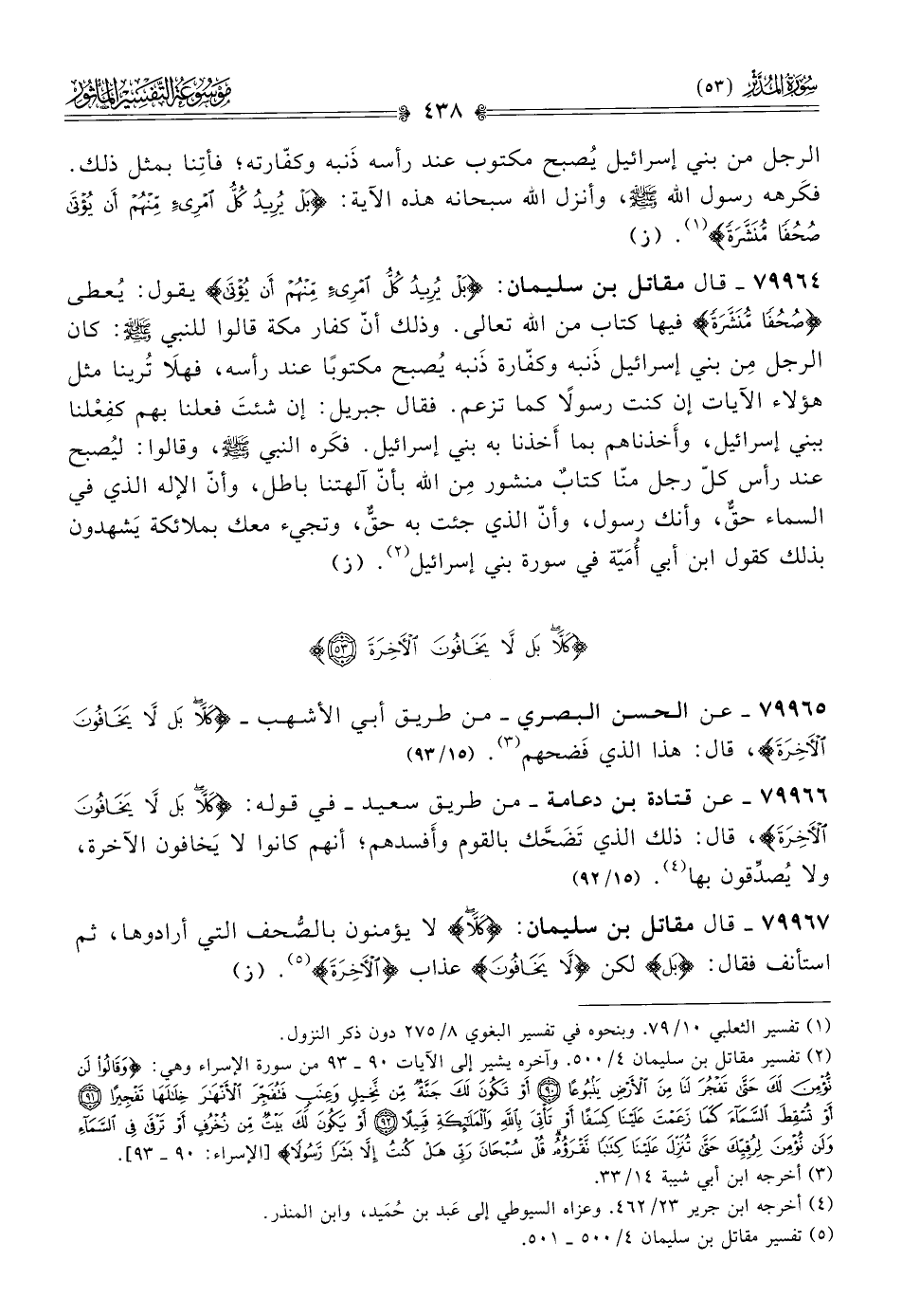 ٧٩٩٦٤ - قال مقاتل بن سليمان: {بَلْ يُرِيدُ كُلُّ امْرِئٍ مِنهُمْ أنْ يُؤْتى} يقول: يُعطى {صُحُفًا مُنَشَّرَةً} فيها كتاب من الله تعالى. وذلك أنّ كفار مكة قالوا للنبي - صلى الله عليه وسلم -: كان الرجل مِن بني إسرائيل ذَنبه وكفّارة ذَنبه يُصبح مكتوبًا عند رأسه، فهلا تُرينا مثل هؤلاء الآيات إن كنت رسولًا كما تزعم. فقال جبريل: إن شئتَ فعلنا بهم كفِعْلنا ببني إسرائيل، وأَخذناهم بما أخذنا به بني إسرائيل. فكَره النبي - صلى الله عليه وسلم -، وقالوا: ليُصبح عند رأس كلّ رجل منّا كتابٌ منشور مِن الله بأنّ آلهتنا باطل، وأنّ الإله الذي في السماء حقٌّ، وأنك رسول، وأنّ الذي جئت به حقٌّ، وتجيء معك بملائكة يَشهدون بذلك كقول ابن أبي أُمَيّة في سورة بني إسرائيل (¬٢). (ز)
